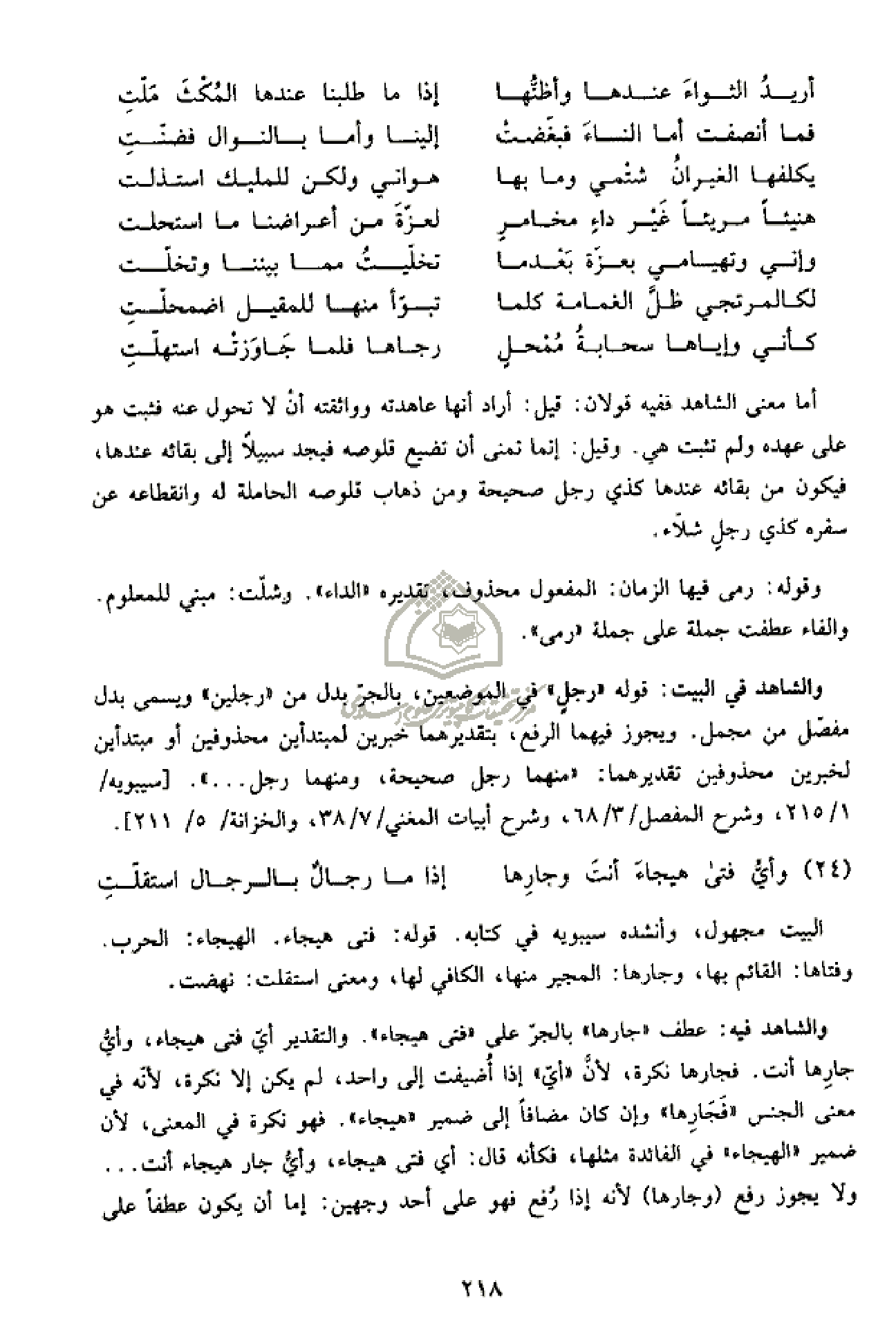 والشاهد فيه: عطف «جارها» بالجرّ على «فتى هيجاء». والتقدير أيّ فتى هيجاء، وأيّ جارها أنت. فجارها نكرة، لأنّ «أيّ» إذا أضيفت إلى واحد، لم يكن إلا نكرة، لأنّه في معنى الجنس «فجارها» وإن كان مضافا إلى ضمير «هيجاء». فهو نكرة في المعنى، لأن ضمير «الهيجاء» في الفائدة مثلها، فكأنه قال: أي فتى هيجاء، وأيّ جار هيجاء أنت ...