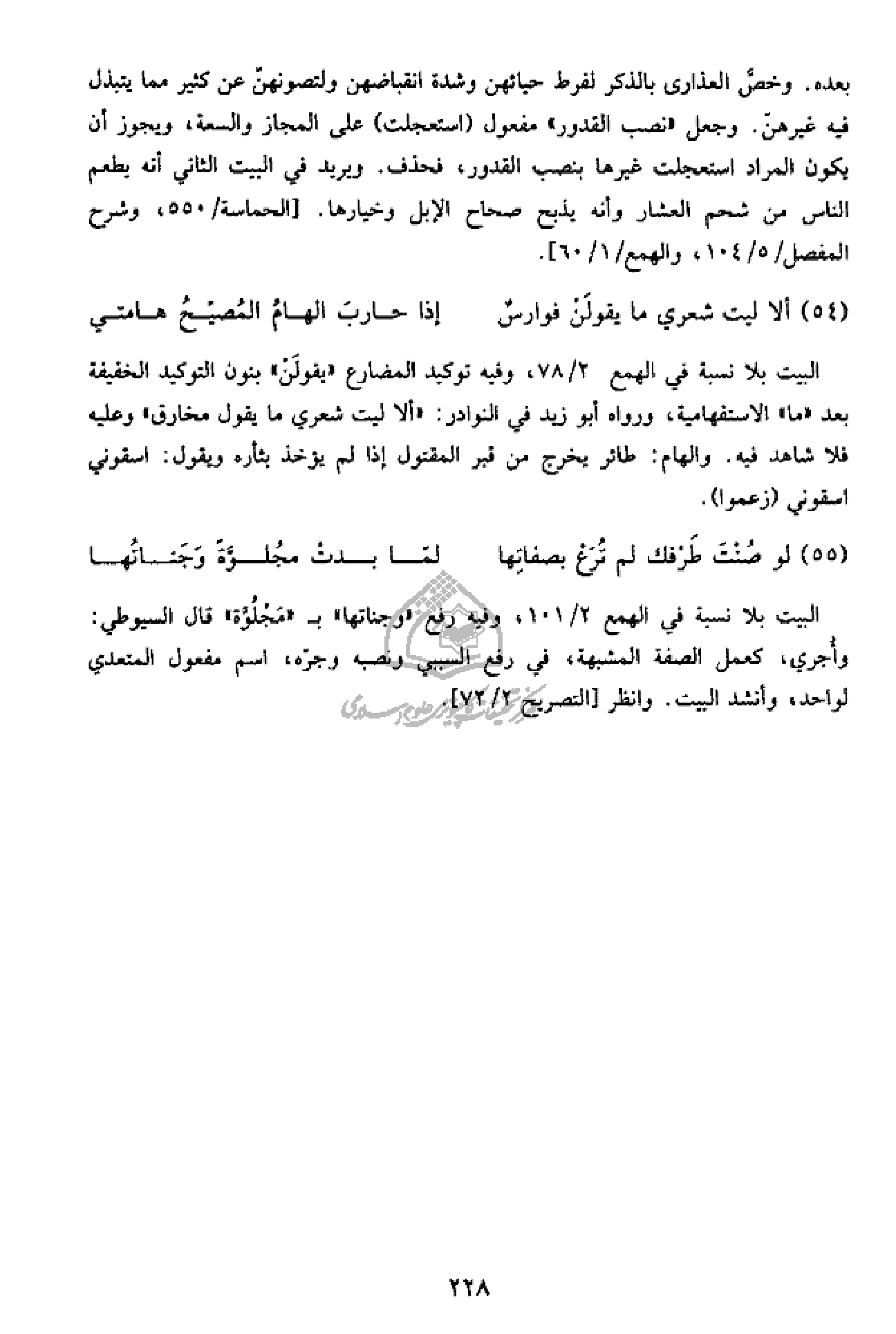 بعده. وخصّ العذارى بالذكر لفرط حيائهن وشدة انقباضهن ولتصونهنّ عن كثير مما يتبذل فيه غيرهنّ. وجعل «نصب القدور» مفعول (استعجلت) على المجاز والسعة، ويجوز أن يكون المراد استعجلت غيرها بنصب القدور، فحذف. ويريد في البيت الثاني أنه يطعم الناس من شحم العشار وأنه يذبح صحاح الإبل وخيارها. [الحماسة/ 550، وشرح المفصل/ 5/ 104، والهمع/ 1/ 60].