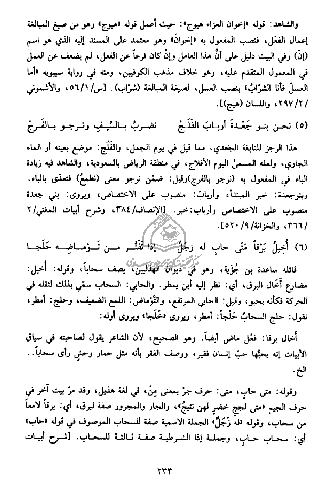 والشاهد: قوله «إخوان العزاء هيوج»: حيث أعمل قوله «هيوج» وهو من صيغ المبالغة إعمال الفعل، فنصب المفعول به «إخوان» وهو معتمد على المسند إليه الذي هو اسم (إنّ) وفي البيت دليل على أنّ هذا العامل وإن كان فرعا عن الفعل، لم يضعف عن العمل في المعمول المتقدم عليه، وهو خلاف مذهب الكوفيين، ومنه في رواية سيبويه «أما العسل فأنا الشرّاب» بنصب العسل، لصيغة المبالغة (شرّاب). [س/ 1/ 56، والأشموني/ 2/ 297، واللسان (هيج)].