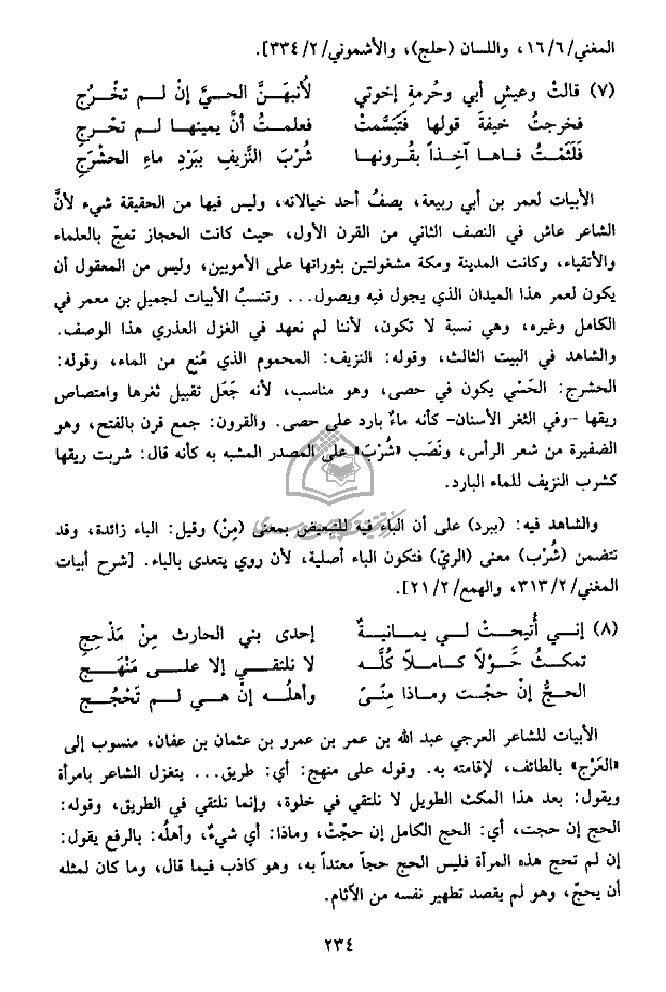 الأبيات للشاعر العرجي عبد الله بن عمر بن عمرو بن عثمان بن عفان، منسوب إلى «العرج» بالطائف، لإقامته به. وقوله على منهج: أي: طريق ... يتغزل الشاعر بامرأة ويقول: بعد هذا المكث الطويل لا نلتقي في خلوة، وإنما نلتقي في الطريق، وقوله: