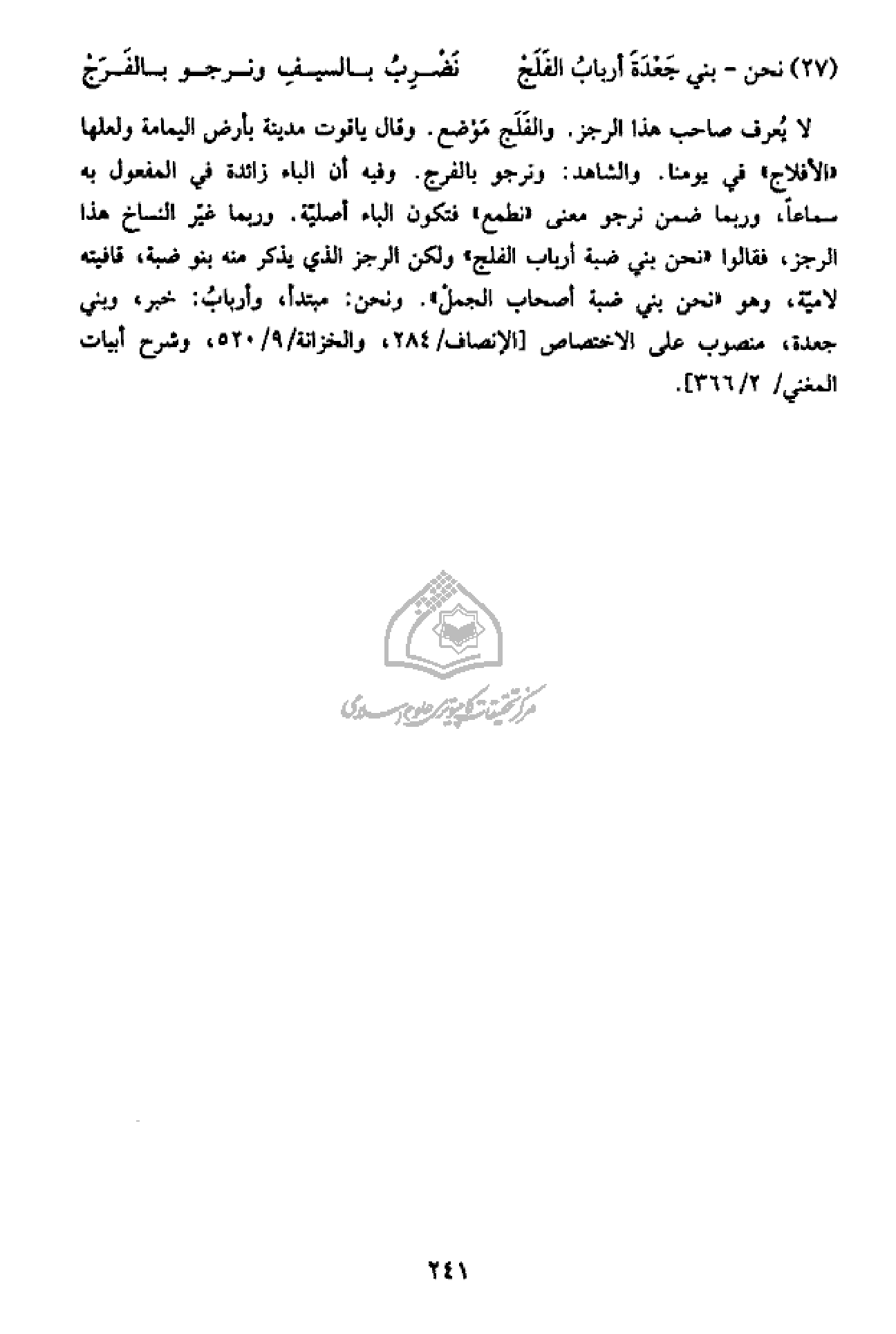 لا يعرف صاحب هذا الرجز. والفلج موضع. وقال ياقوت مدينة بأرض اليمامة ولعلها «الأفلاج» في يومنا. والشاهد: ونرجو بالفرج. وفيه أن الباء زائدة في المفعول به سماعا، وربما ضمن نرجو معنى «نطمع» فتكون الباء أصليّة. وربما غيّر النساخ هذا الرجز، فقالوا «نحن بني ضبة أرباب الفلج» ولكن الرجز الذي يذكر منه بنو ضبة، قافيته لاميّة، وهو «نحن بني ضبة أصحاب الجمل». ونحن: مبتدأ، وأرباب: خبر، وبني جعدة، منصوب على الاختصاص [الإنصاف/ 284، والخزانة/ 9/ 520، وشرح أبيات المغني/ 2/ 366].