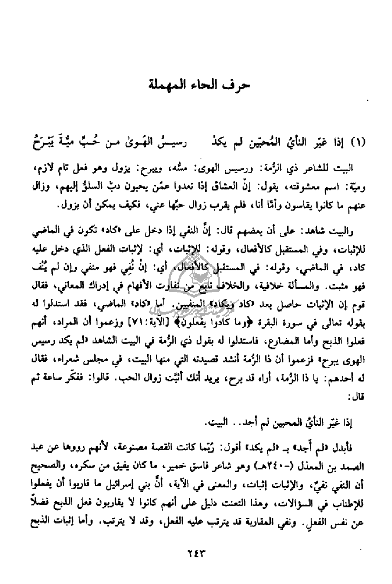 والبيت شاهد: على أن بعضهم قال: إنّ النفي إذا دخل على «كاد» تكون في الماضي للإثبات، وفي المستقبل كالأفعال، وقوله: للإثبات، أي: لإثبات الفعل الذي دخل عليه كاد، في الماضي، وقوله: في المستقبل كالأفعال، أي: إن نفي فهو منفي وإن لم ينف فهو مثبت. والمسألة خلافية، والخلاف نابع من تفاوت الأفهام في إدراك المعاني، فقال قوم إن الإثبات حاصل بعد «كاد ويكاد» المنفيين. أما «كاد» الماضي، فقد استدلوا له بقوله تعالى في سورة البقرة وَما كادُوا يَفْعَلُونَ [الآية: 71] وزعموا أن المراد، أنهم فعلوا الذبح وأما المضارع، فاستدلوا له بقول ذي الرّمة في البيت الشاهد «لم يكد رسيس الهوى يبرح» فزعموا أن ذا الرّمة أنشد قصيدته التي منها البيت، في مجلس شعراء، فقال له أحدهم: يا ذا الرّمة، أراه قد برح، يريد أنك أثبّت زوال الحب. قالوا: ففكّر ساعة ثم قال:
