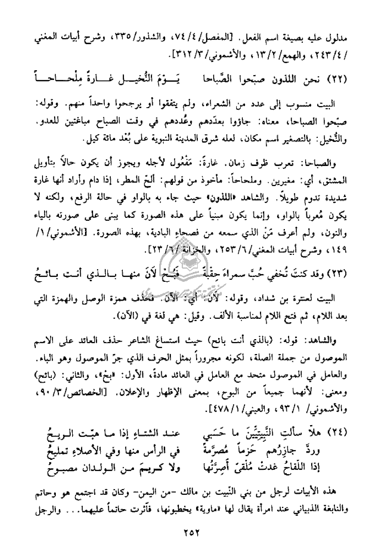 والصباحا: تعرب ظرف زمان. غارة: مفعول لأجله ويجوز أن يكون حالا بتأويل المشتق، أي: مغيرين. وملحاحا: مأخوذ من قولهم: ألحّ المطر، إذا دام وأراد أنها غارة شديدة تدوم طويلا. والشاهد «اللذون» حيث جاء به بالواو في حالة الرفع، ولكنه لا يكون معربا بالواو، وإنما يكون مبنيا على هذه الصورة كما يبنى على صورته بالياء والنون، ولم أعرف من الذي سمعه من فصحاء البادية، بهذه الصورة. [الأشموني/ 1/ 149، وشرح أبيات المغني/ 6/ 253، والخزانة/ 6/ 23].