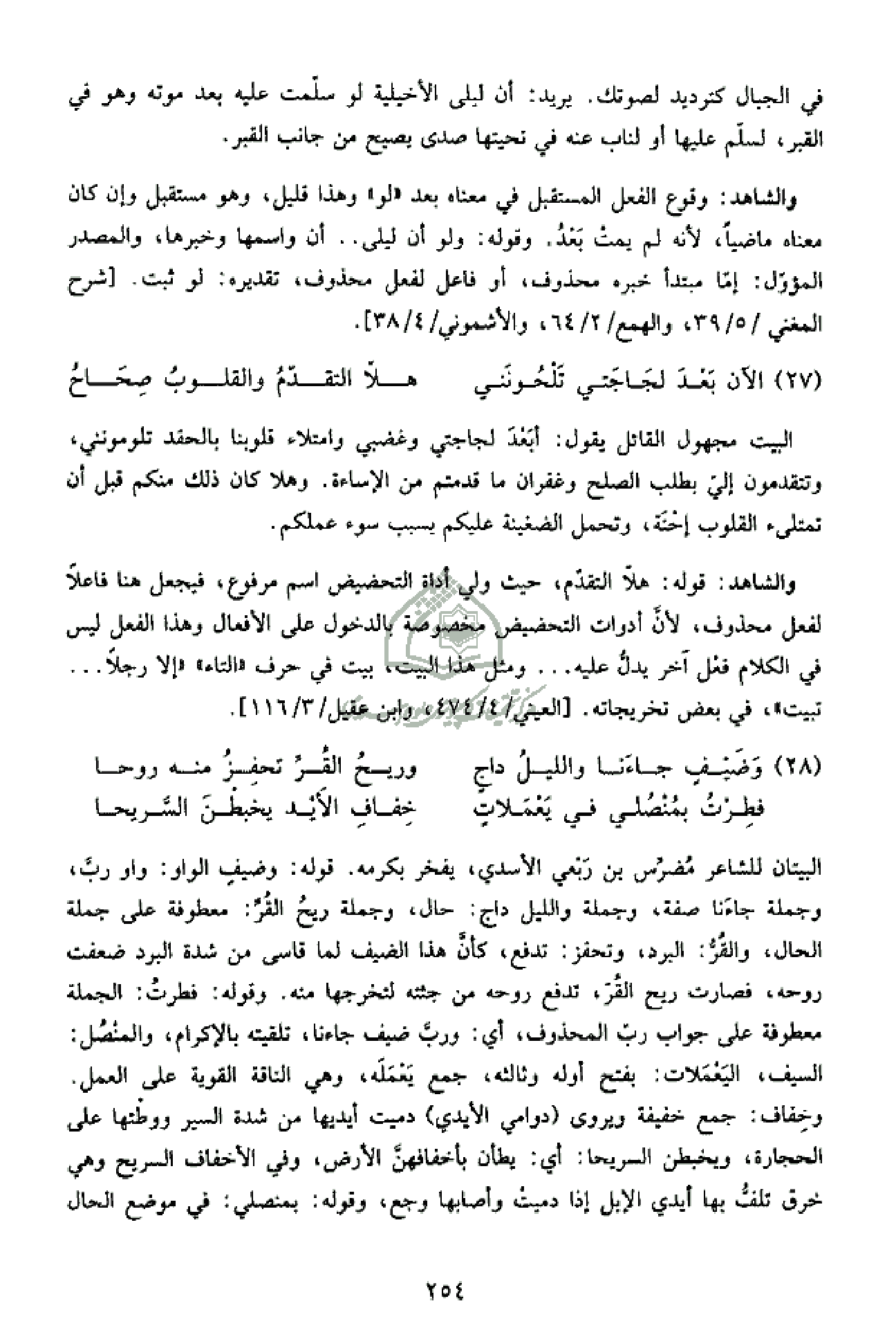 والشاهد: قوله: هلّا التقدّم، حيث ولي أداة التحضيض اسم مرفوع، فيجعل هنا فاعلا لفعل محذوف، لأنّ أدوات التحضيض مخصوصة بالدخول على الأفعال وهذا الفعل ليس في الكلام فعل آخر يدلّ عليه ... ومثل هذا البيت، بيت في حرف «التاء» «إلا رجلا ...