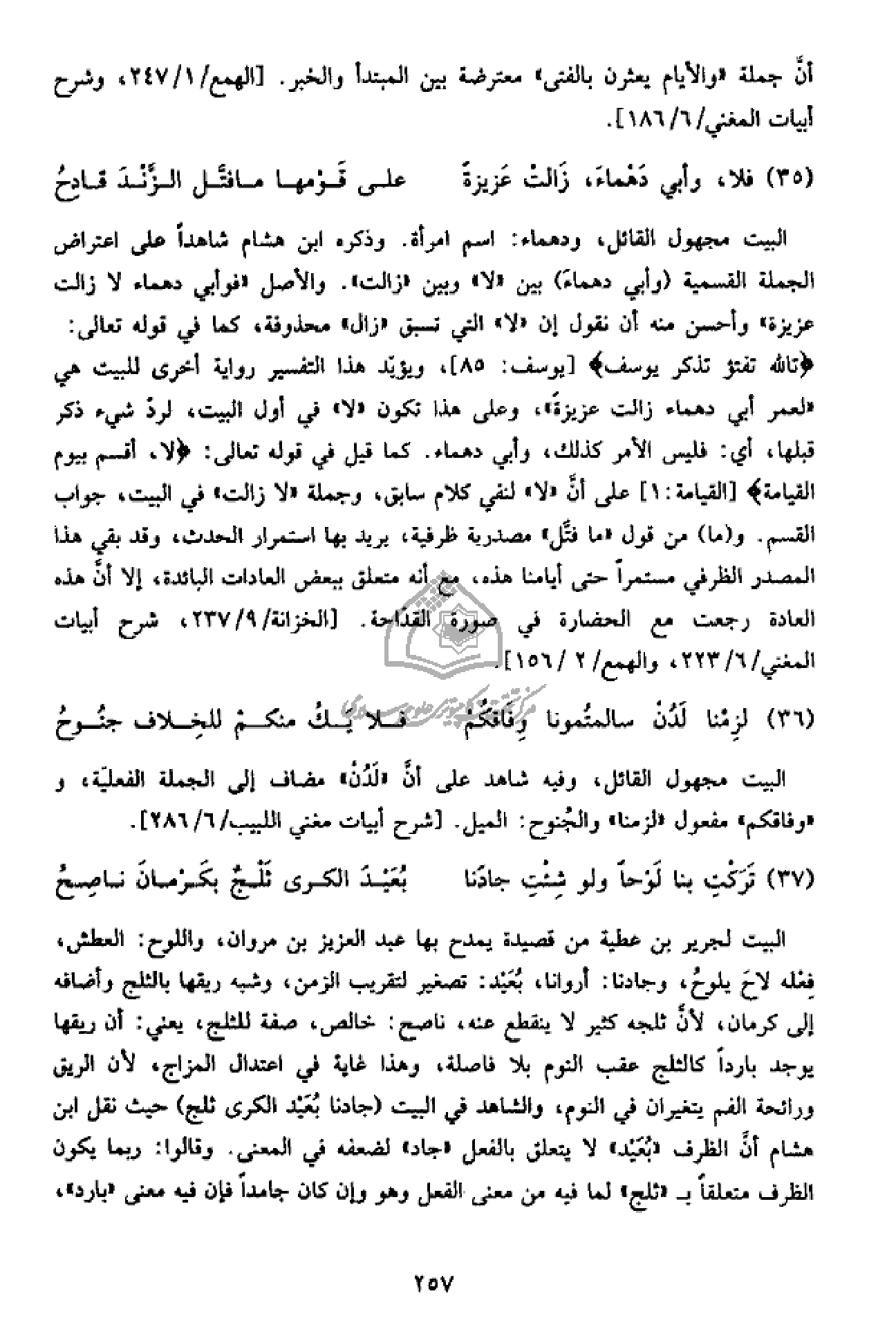 البيت مجهول القائل، ودهماء: اسم امرأة. وذكره ابن هشام شاهدا على اعتراض الجملة القسمية (وأبي دهماء) بين «لا» وبين «زالت». والأصل «فو أبي دهماء لا زالت عزيزة» وأحسن منه أن نقول إن «لا» التي تسبق «زال» محذوفة، كما في قوله تعالى:
