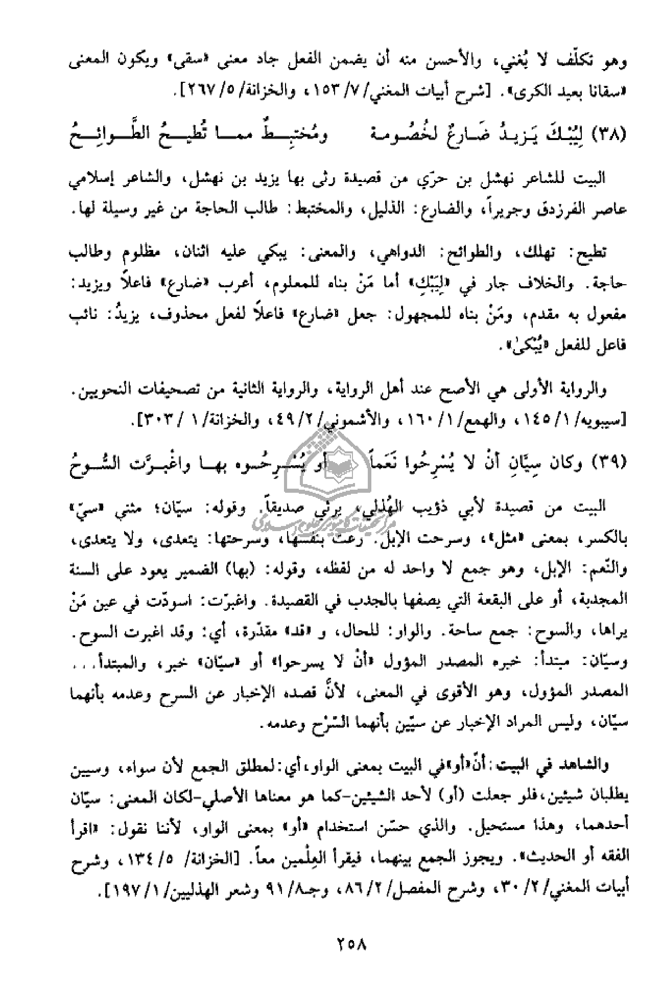 والشاهد في البيت: أنّ «أو» في البيت بمعنى الواو، أي: لمطلق الجمع لأن سواء، وسيين يطلبان شيئين، فلو جعلت (أو) لأحد الشيئين - كما هو معناها الأصلي - لكان المعنى: سيّان أحدهما، وهذا مستحيل. والذي حسّن استخدام «أو» بمعنى الواو، لأننا نقول: «اقرأ الفقه أو الحديث». ويجوز الجمع بينهما، فيقرأ العلمين معا. [الخزانة/ 5/ 134، وشرح أبيات المغني/ 2/ 30، وشرح المفصل/ 2/ 86، وج 8/ 91 وشعر الهذليين/ 1/ 197].