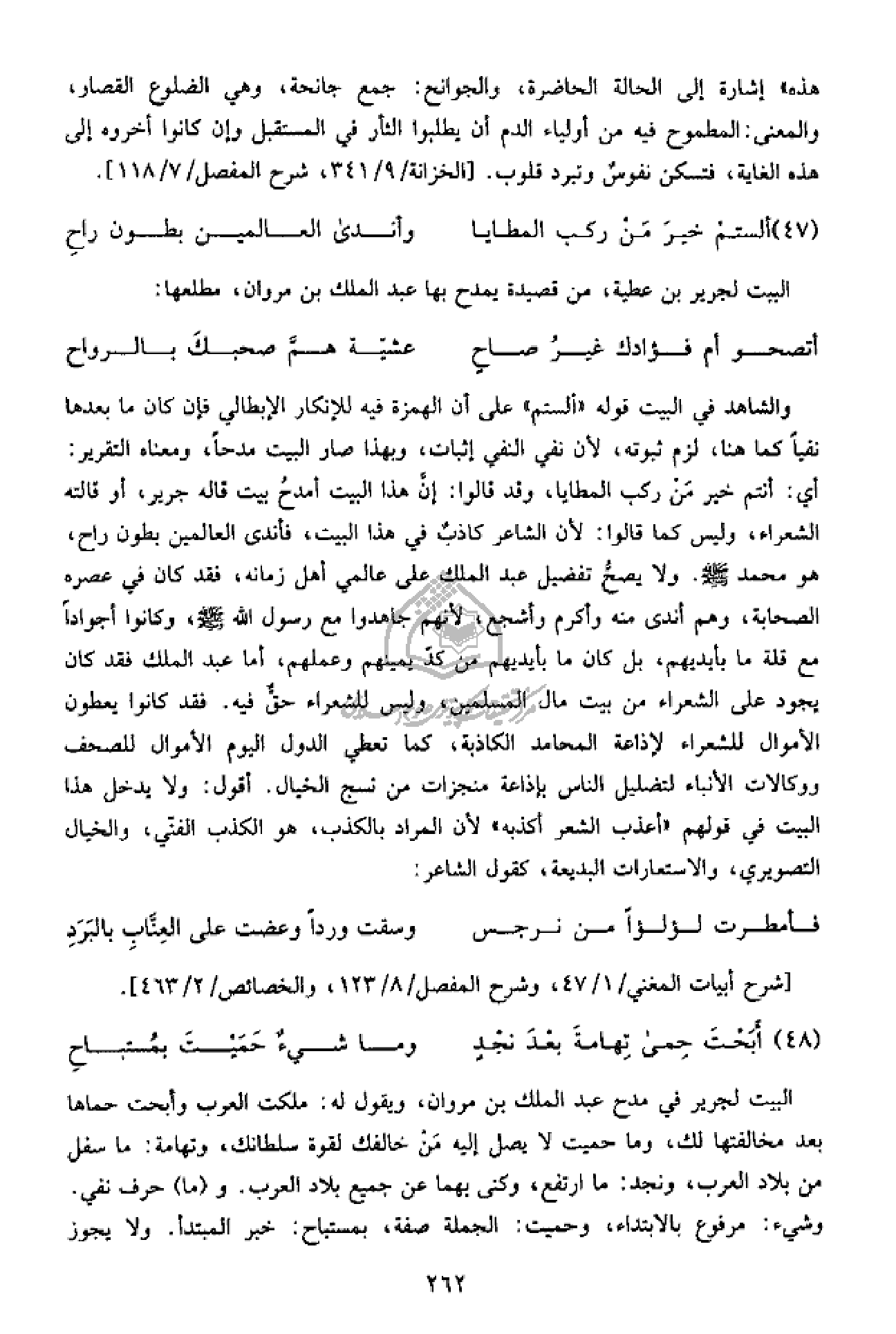 أي: أنتم خير من ركب المطايا، وقد قالوا: إنّ هذا البيت أمدح بيت قاله جرير، أو قالته الشعراء، وليس كما قالوا: لأن الشاعر كاذب في هذا البيت، فأندى العالمين بطون راح، هو محمد صلّى الله عليه وسلّم. ولا يصحّ تفضيل عبد الملك على عالمي أهل زمانه، فقد كان في عصره الصحابة، وهم أندى منه وأكرم وأشجع، لأنهم جاهدوا مع رسول الله صلّى الله عليه وسلّم، وكانوا أجوادا مع قلة ما بأيديهم، بل كان ما بأيديهم من كدّ يمينهم وعملهم، أما عبد الملك فقد كان يجود على الشعراء من بيت مال المسلمين، وليس للشعراء حقّ فيه. فقد كانوا يعطون الأموال للشعراء لإذاعة المحامد الكاذبة، كما تعطي الدول اليوم الأموال للصحف ووكالات الأنباء لتضليل الناس بإذاعة منجزات من نسج الخيال. أقول: ولا يدخل هذا البيت في قولهم «أعذب الشعر أكذبه» لأن المراد بالكذب، هو الكذب الفنّي، والخيال التصويري، والاستعارات البديعة، كقول الشاعر:
