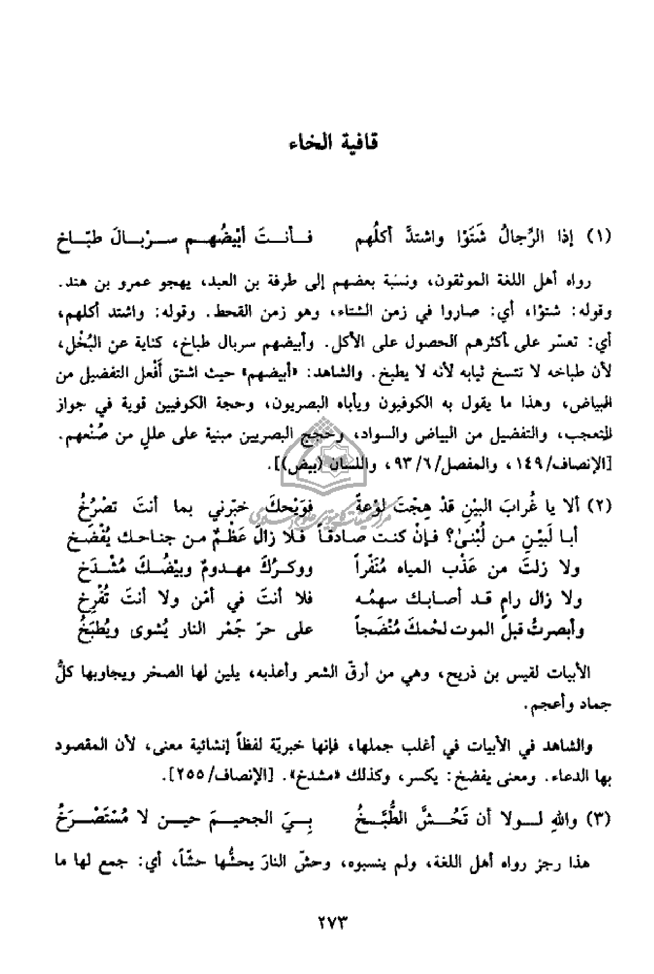 والشاهد في الأبيات في أغلب جملها، فإنها خبريّة لفظا إنشائية معنى، لأن المقصود بها الدعاء. ومعنى يفضخ: يكسر، وكذلك «مشدخ». [الإنصاف/ 255].