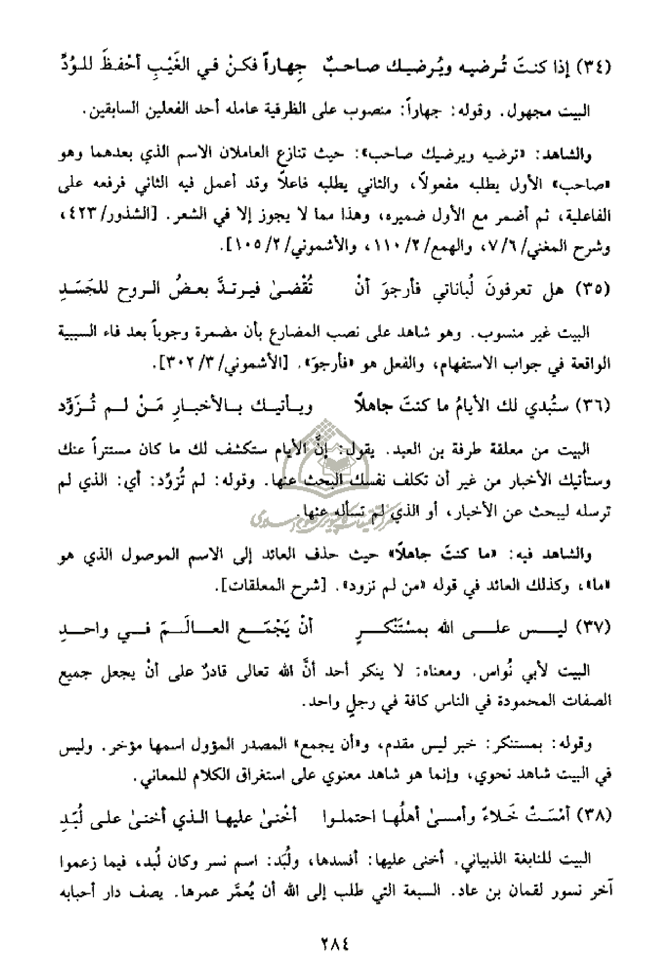 والشاهد: «ترضيه ويرضيك صاحب»: حيث تنازع العاملان الاسم الذي بعدهما وهو «صاحب» الأول يطلبه مفعولا، والثاني يطلبه فاعلا وقد أعمل فيه الثاني فرفعه على الفاعلية، ثم أضمر مع الأول ضميره، وهذا مما لا يجوز إلا في الشعر. [الشذور/ 423، وشرح المغني/ 6/ 7، والهمع/ 2/ 110، والأشموني/ 2/ 105].