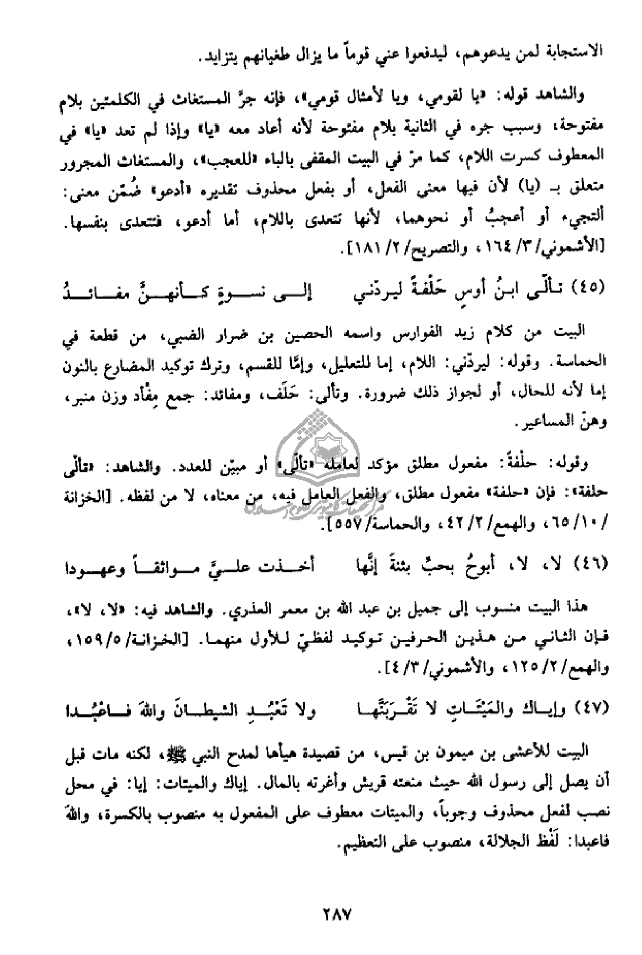 والشاهد قوله: «يا لقومي، ويا لأمثال قومي»، فإنه جرّ المستغاث في الكلمتين بلام مفتوحة، وسبب جره في الثانية بلام مفتوحة لأنه أعاد معه «يا» وإذا لم تعد «يا» في المعطوف كسرت اللام، كما مرّ في البيت المقفى بالباء «للعجب»، والمستغاث المجرور متعلق ب (يا) لأن فيها معنى الفعل، أو بفعل محذوف تقديره «أدعو» ضمّن معنى: