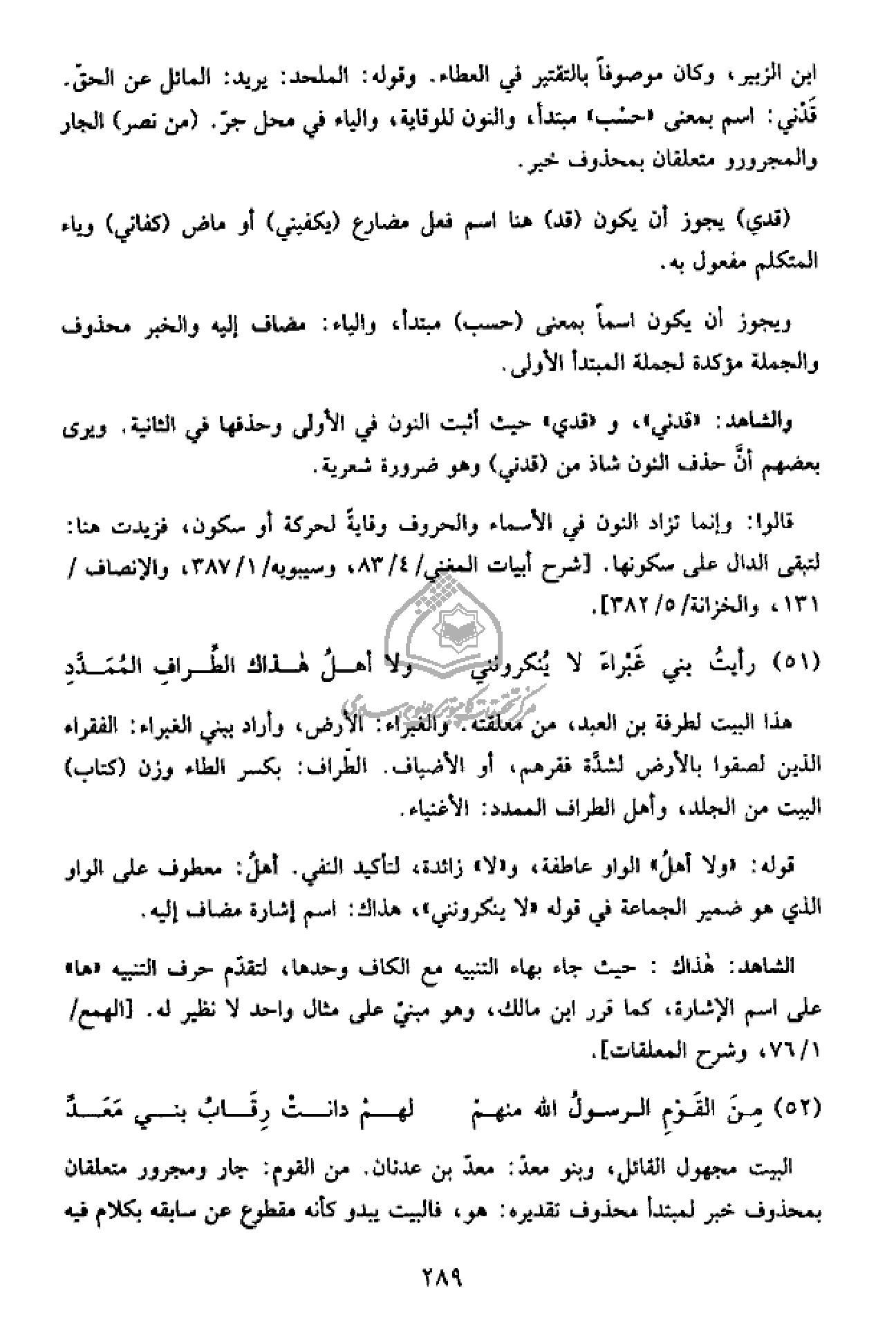 والشاهد: «قدني»، و «قدي» حيث أثبت النون في الأولى وحذفها في الثانية. ويرى بعضهم أنّ حذف النون شاذ من (قدني) وهو ضرورة شعرية.