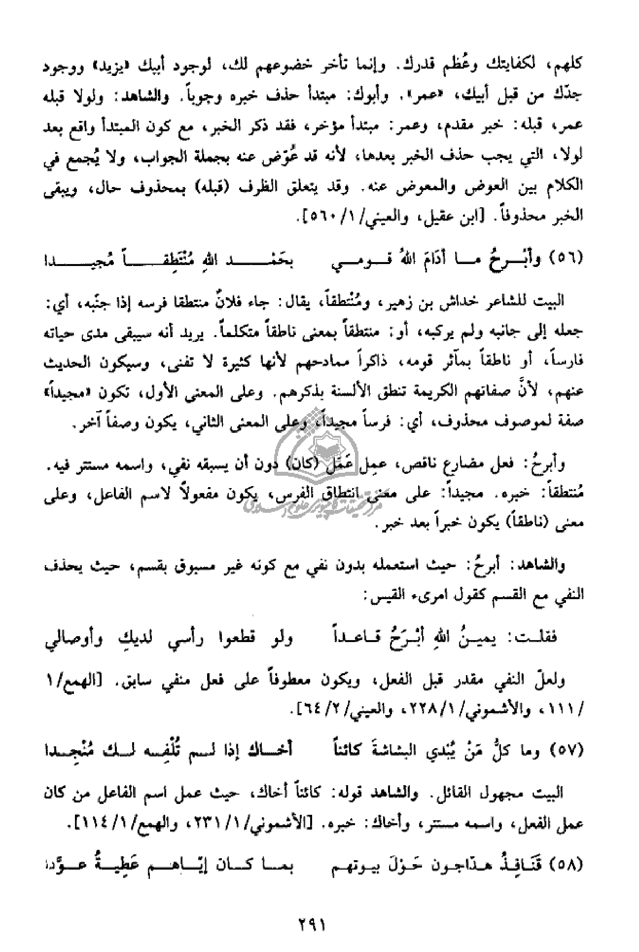 كلهم، لكفايتك وعظم قدرك. وإنما تأخر خضوعهم لك، لوجود أبيك «يزيد» ووجود جدّك من قبل أبيك، «عمر». وأبوك: مبتدأ حذف خبره وجوبا. والشاهد: ولولا قبله عمر، قبله: خبر مقدم، وعمر: مبتدأ مؤخر، فقد ذكر الخبر، مع كون المبتدأ واقع بعد لولا، التي يجب حذف الخبر بعدها، لأنه قد عوّض عنه بجملة الجواب، ولا يجمع في الكلام بين العوض والمعوض عنه. وقد يتعلق الظرف (قبله) بمحذوف حال، ويبقى الخبر محذوفا. [ابن عقيل، والعيني/ 1/ 560].