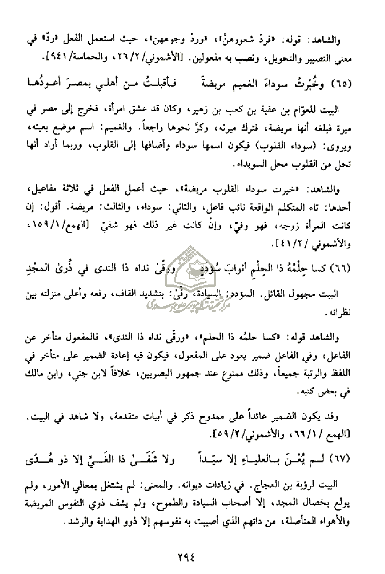 والشاهد قوله: «كسا حلمه ذا الحلم»، «ورقّى نداه ذا الندى»، فالمفعول متأخر عن الفاعل، وفي الفاعل ضمير يعود على المفعول، فيكون فيه إعادة الضمير على متأخر في اللفظ والرتبة جميعا، وذلك ممنوع عند جمهور البصريين، خلافا لابن جني، وابن مالك في بعض كتبه.
