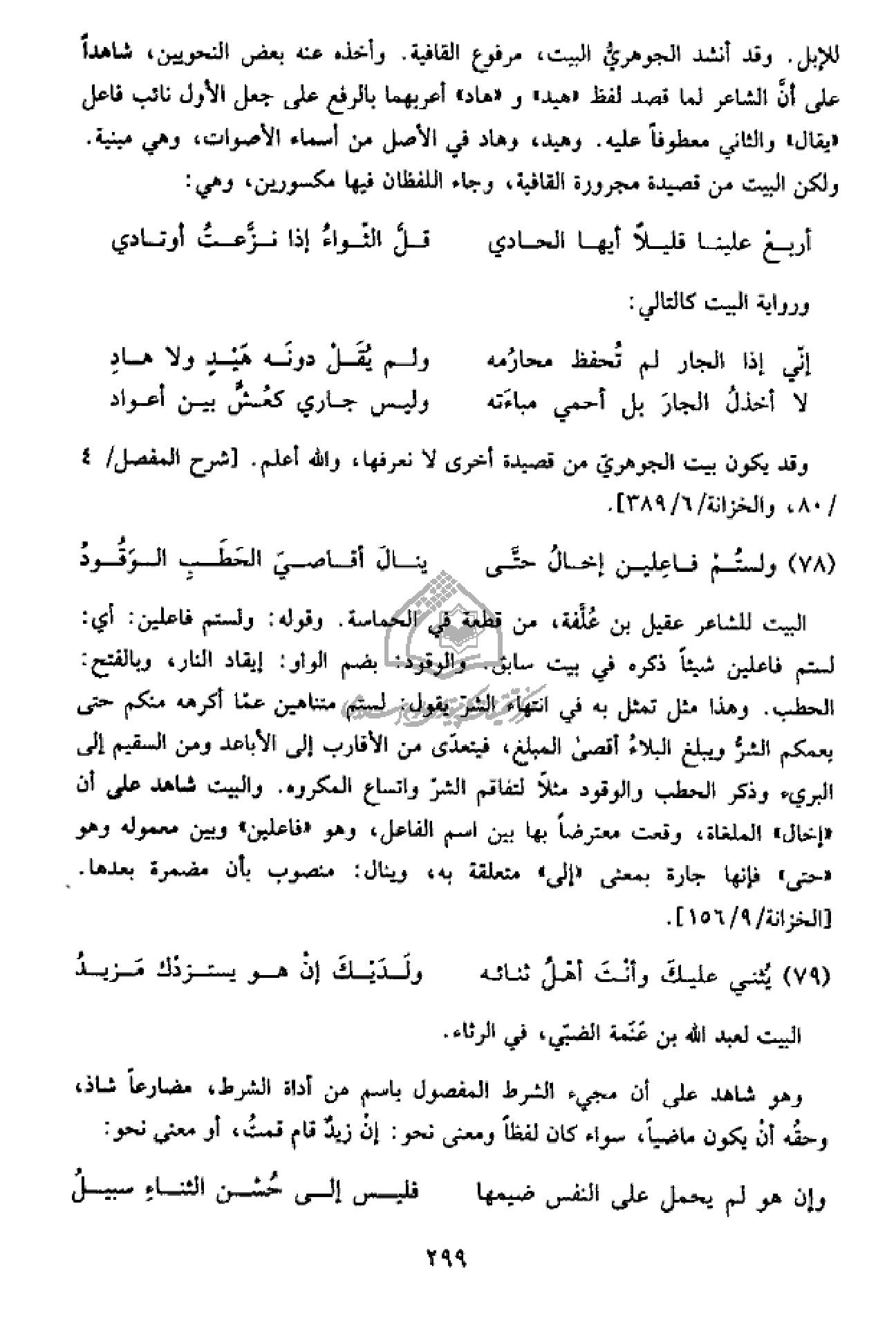 الحطب. وهذا مثل تمثل به في انتهاء الشرّ يقول: لستم متناهين عمّا أكرهه منكم حتى يعمكم الشرّ ويبلغ البلاء أقصى المبلغ، فيتعدّى من الأقارب إلى الأباعد ومن السقيم إلى البريء وذكر الحطب والوقود مثلا لتفاقم الشرّ واتساع المكروه. والبيت شاهد على أن «إخال» الملغاة، وقعت معترضا بها بين اسم الفاعل، وهو «فاعلين» وبين معموله وهو «حتى» فإنها جارة بمعنى «إلى» متعلقة به، وينال: منصوب بأن مضمرة بعدها.