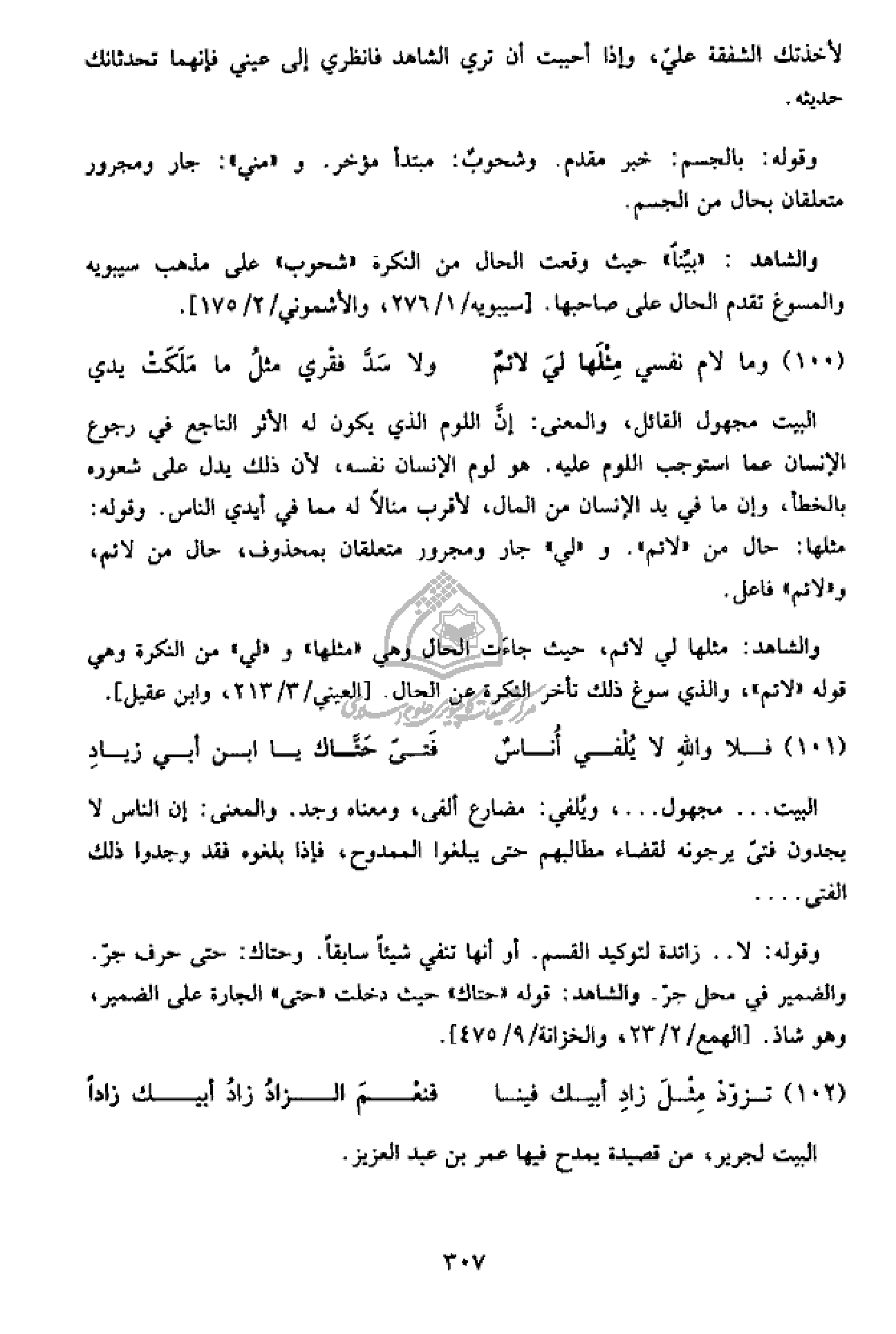 والشاهد: مثلها لي لائم، حيث جاءت الحال وهي «مثلها» و «لي» من النكرة وهي قوله «لائم»، والذي سوغ ذلك تأخر النكرة عن الحال. [العيني/ 3/ 213، وابن عقيل].