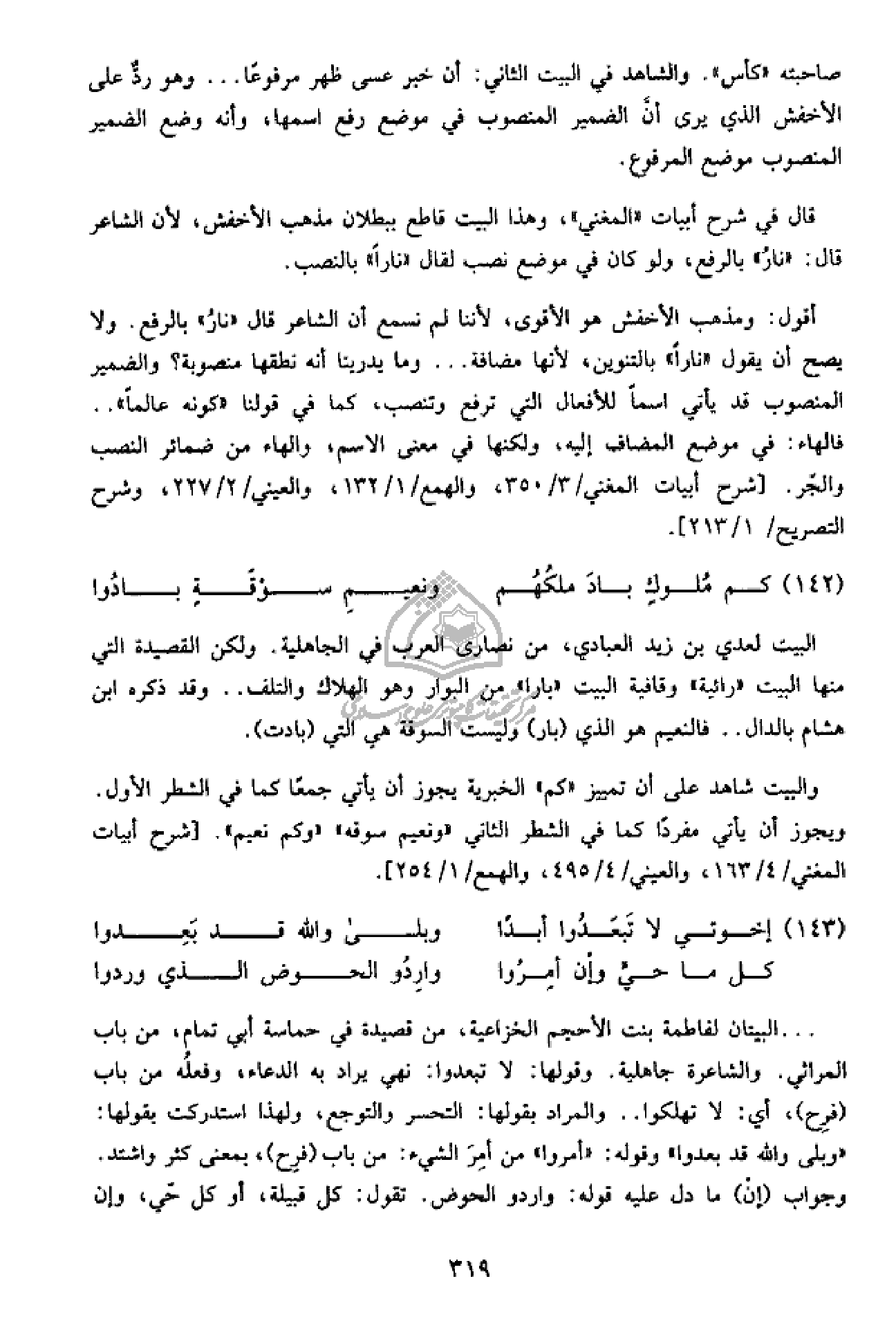 قال في شرح أبيات «المغني»، وهذا البيت قاطع ببطلان مذهب الأخفش، لأن الشاعر قال: «نار» بالرفع، ولو كان في موضع نصب لقال «نارا» بالنصب.