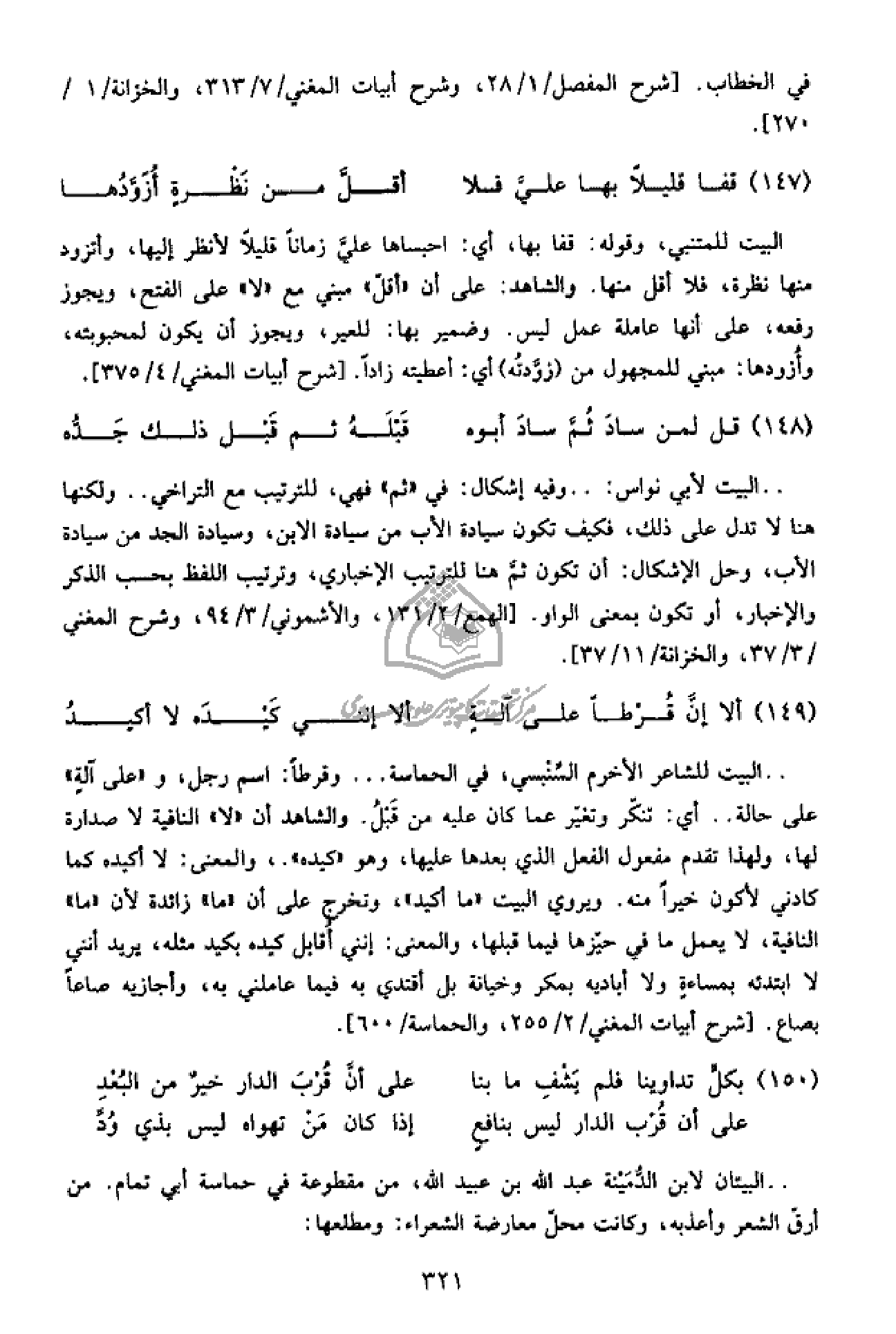 البيت للمتنبي، وقوله: قفا بها، أي: احبساها عليّ زمانا قليلا لأنظر إليها، وأتزود منها نظرة، فلا أقل منها. والشاهد: على أن «أقلّ» مبني مع «لا» على الفتح، ويجوز رفعه، على أنها عاملة عمل ليس. وضمير بها: للعير، ويجوز أن يكون لمحبوبته، وأزودها: مبني للمجهول من (زوّدته) أي: أعطيته زادا. [شرح أبيات المغني/ 4/ 375].