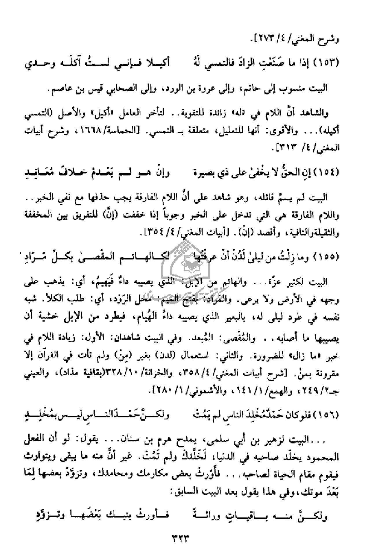 والشاهد أنّ اللام في «له» زائدة للتقوية .. لتأخر العامل «أكيل» والأصل (التمسي أكيله) ... والأقوى: أنها للتعليل، متعلقة ب التمسي. [الحماسة/ 1668، وشرح أبيات المغني/ 4/ 313].