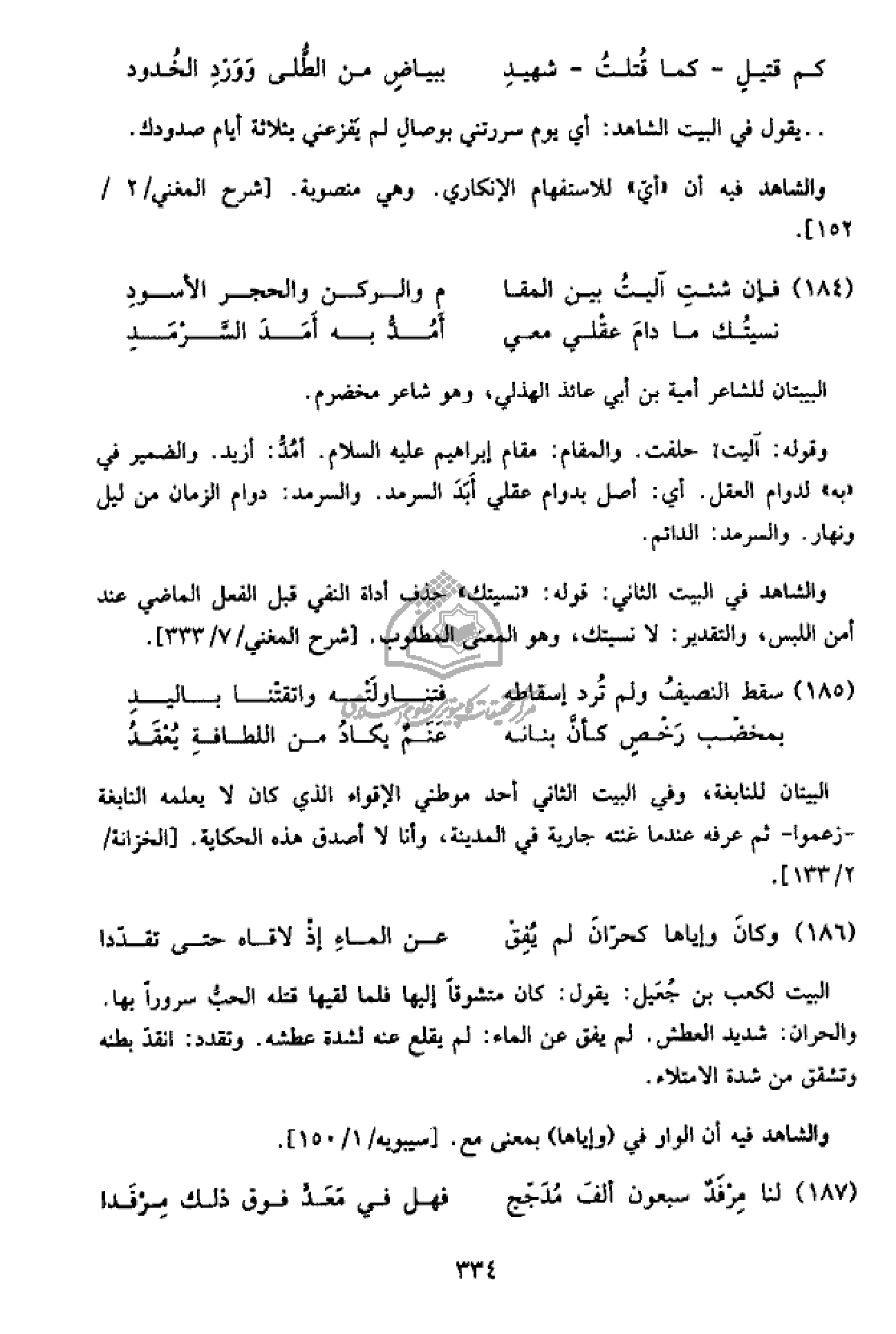 والشاهد في البيت الثاني: قوله: «نسيتك» حذف أداة النفي قبل الفعل الماضي عند أمن اللبس، والتقدير: لا نسيتك، وهو المعنى المطلوب. [شرح المغني/ 7/ 333].