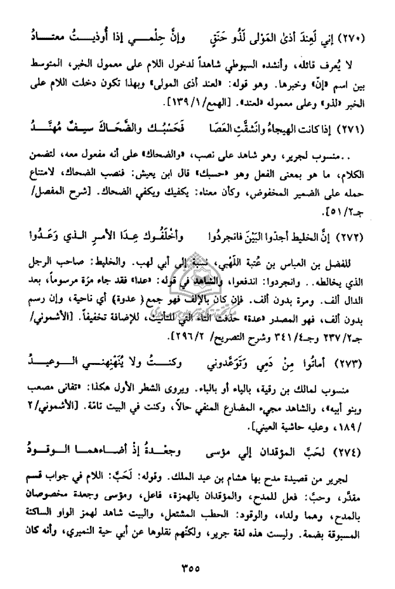 للفضل بن العباس بن عتبة اللهبي، نسبة إلى أبي لهب. والخليط: صاحب الرجل الذي يخالطه .. وانجردوا: اندفعوا، والشاهد في قوله: «عدا» فقد جاء مرة مرسوما، بعد الدال ألف. ومرة بدون ألف. فإن كان بالإلف فهو جمع (عدوة) أي ناحية، وإن رسم بدون ألف، فهو المصدر «عدة» حذفت التاء التي للتأنيث، للإضافة تخفيفا. [الأشموني/ ج 2/ 237 وج 4/ 341 وشرح التصريح/ 2/ 296].