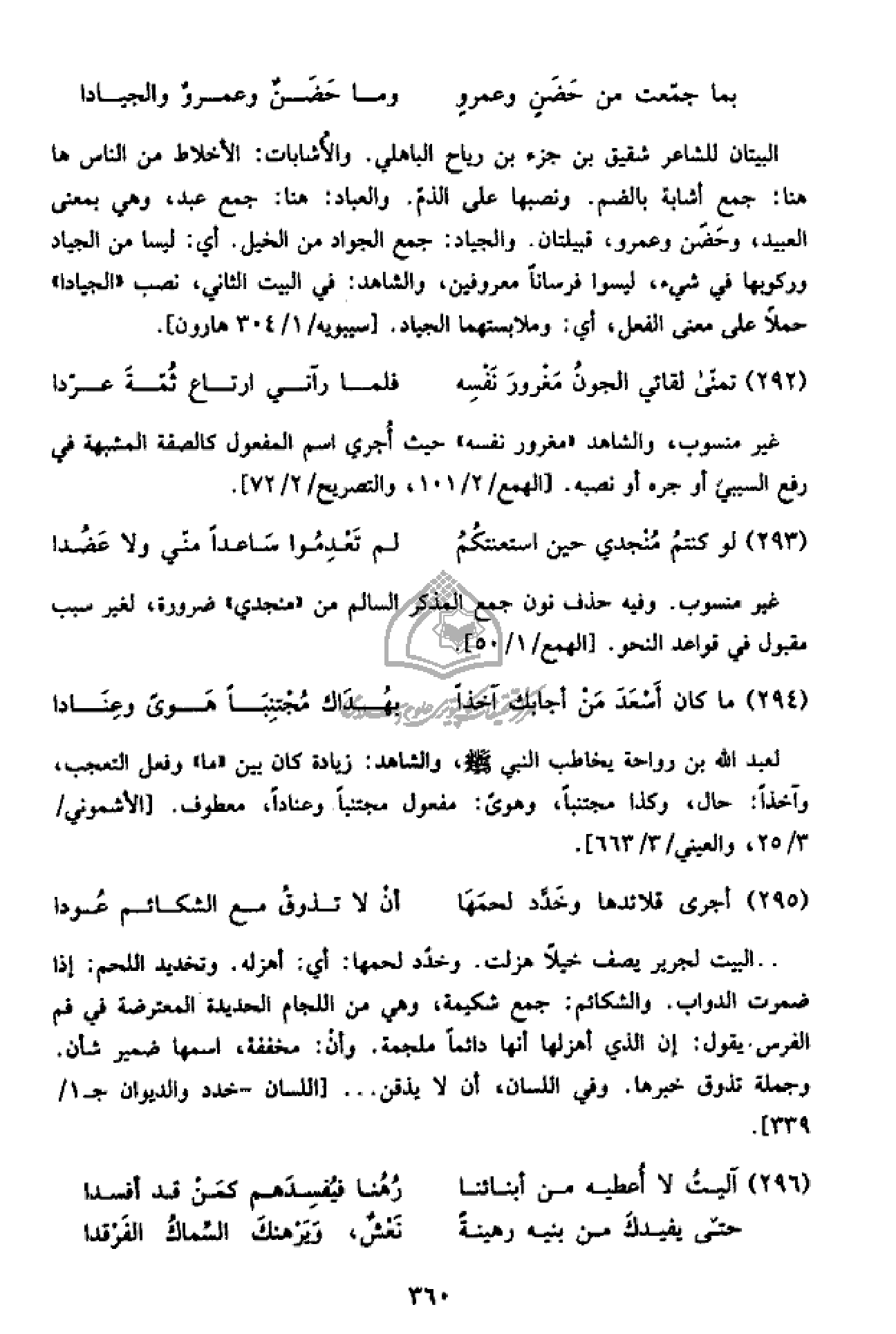 البيتان للشاعر شقيق بن جزء بن رياح الباهلي. والأشابات: الأخلاط من الناس ها هنا: جمع أشابة بالضم. ونصبها على الذمّ. والعباد: هنا: جمع عبد، وهي بمعنى العبيد، وحضن وعمرو، قبيلتان. والجياد: جمع الجواد من الخيل. أي: ليسا من الجياد وركوبها في شيء، ليسوا فرسانا معروفين، والشاهد: في البيت الثاني، نصب «الجيادا» حملا على معنى الفعل، أي: وملابستهما الجياد. [سيبويه/ 1/ 304 هارون].