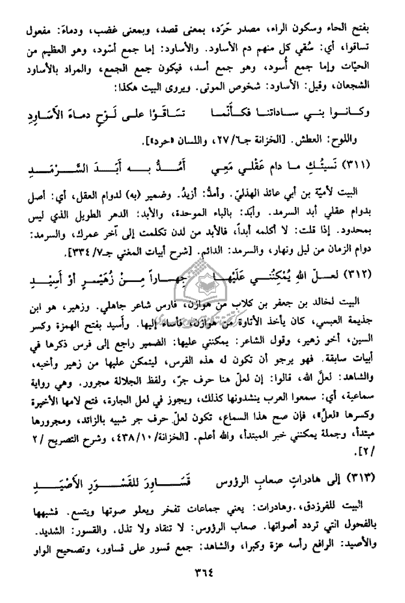 البيت لأميّة بن أبي عائذ الهذليّ. وأمدّ: أزيد. وضمير (به) لدوام العقل، أي: أصل بدوام عقلي أبد السرمد. وأبد: بالباء الموحدة، والأبد: الدهر الطويل الذي ليس بمحدود. إذا قلت: لا أكلمه أبدا، فالأبد من لدن تكلمت إلى آخر