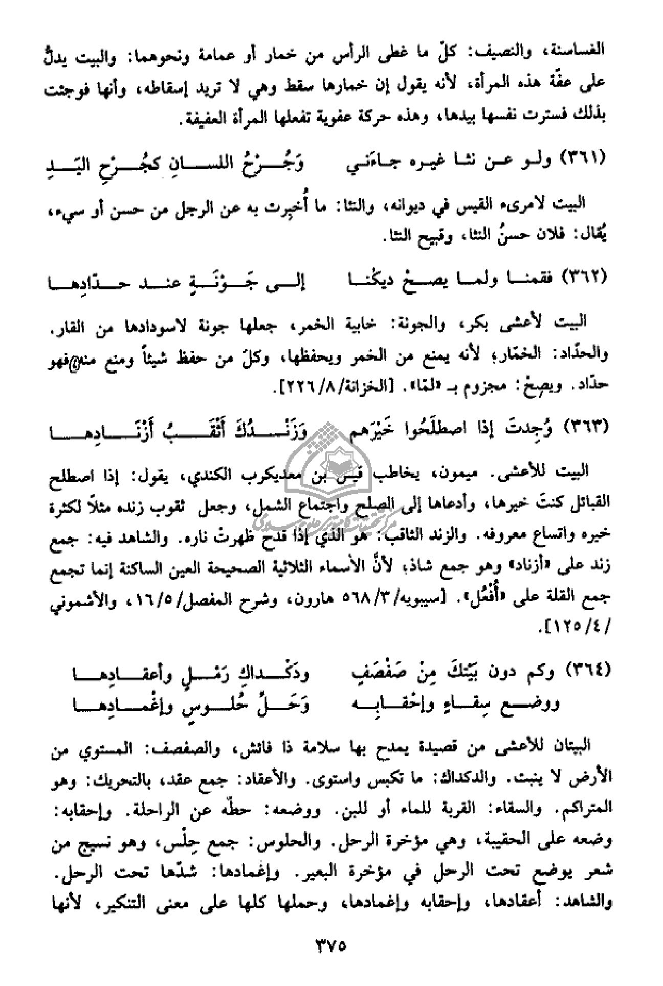 الغساسنة، والنصيف: كلّ ما غطى الرأس من خمار أو عمامة ونحوهما: والبيت يدلّ على عفّة هذه المرأة، لأنه يقول إن خمارها سقط وهي لا تريد إسقاطه، وأنها فوجئت بذلك فسترت نفسها بيدها، وهذه حركة عفوية تفعلها المرأة العفيفة.