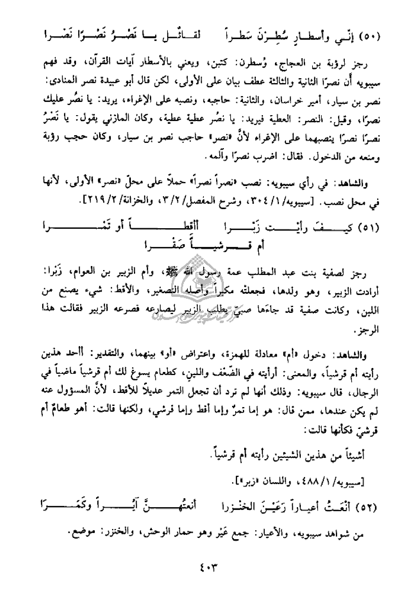 رجز لرؤبة بن العجاج، وسطرن: كتبن، ويعني بالأسطار آيات القرآن، وقد فهم سيبويه أّن نصرا الثانية والثالثة عطف بيان على الأولى، لكن قال أبو عبيدة نصر المنادى: