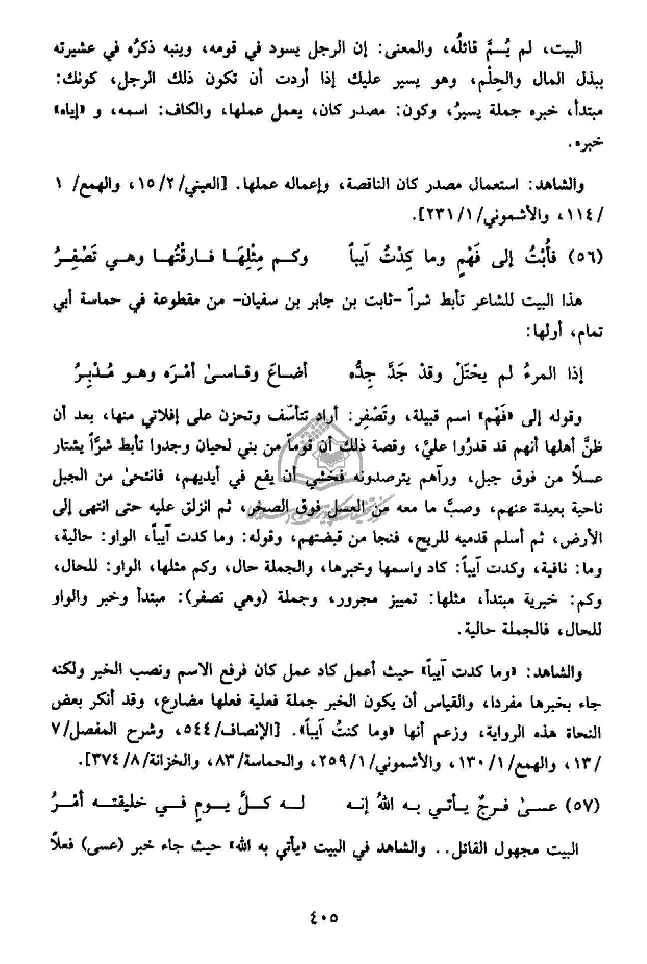 والشاهد: «وما كدت آيبا» حيث أعمل كاد عمل كان فرفع الاسم ونصب الخبر ولكنه جاء بخبرها مفردا، والقياس أن يكون الخبر جملة فعلية فعلها مضارع، وقد أنكر بعض النحاة هذه الرواية، وزعم أنها «وما كنت آيبا».