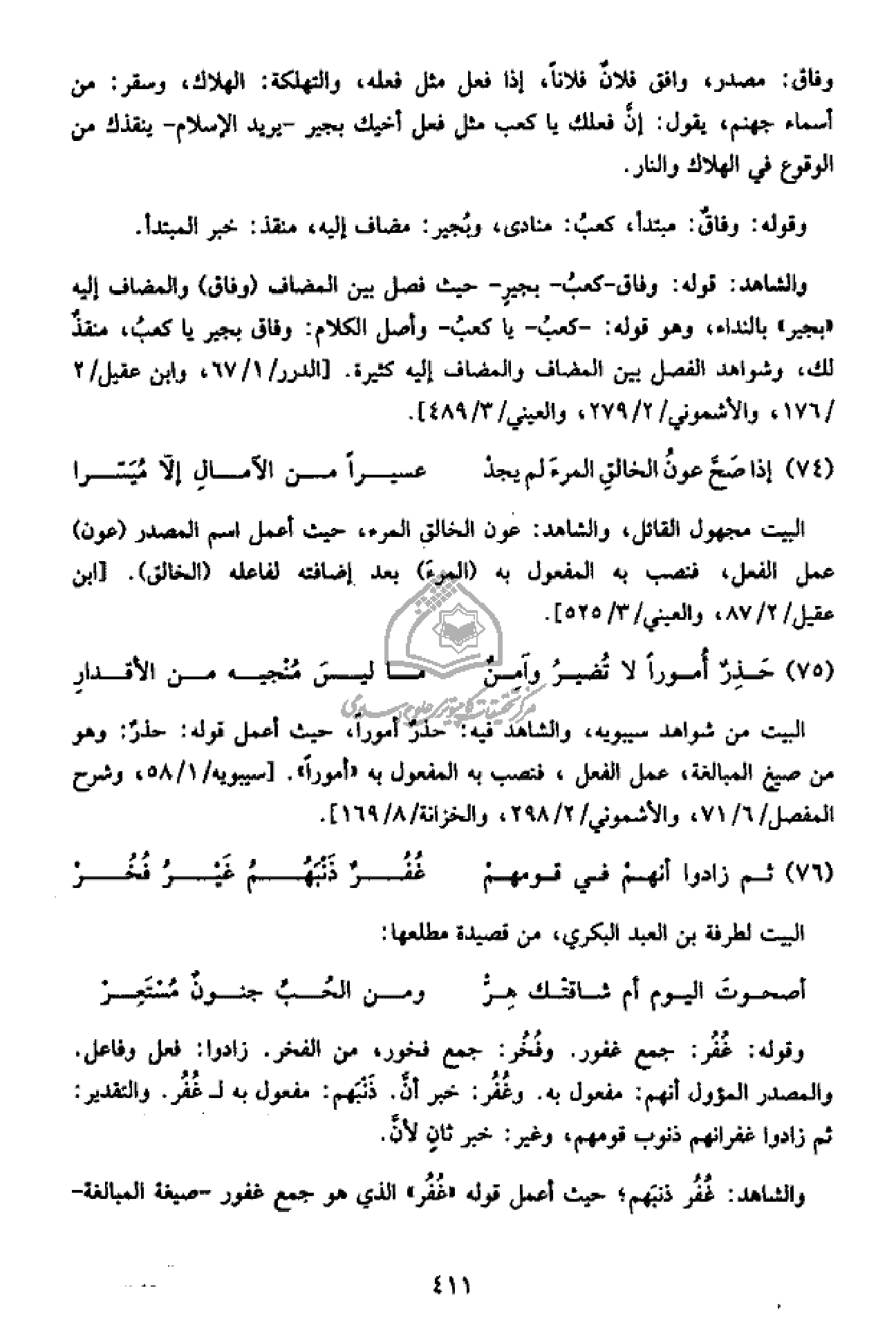 والشاهد: قوله: وفاق - كعب - بجير - حيث فصل بين المضاف (وفاق) والمضاف إليه «بجير» بالنداء، وهو قوله: - كعب - يا كعب - وأصل الكلام: وفاق بجير يا كعب، منقذ لك، وشواهد الفصل بين المضاف والمضاف إليه كثيرة. [الدرر/ 1/ 67، وابن عقيل/ 2/ 176، والأشموني/ 2/ 279، والعيني/ 3/ 489].