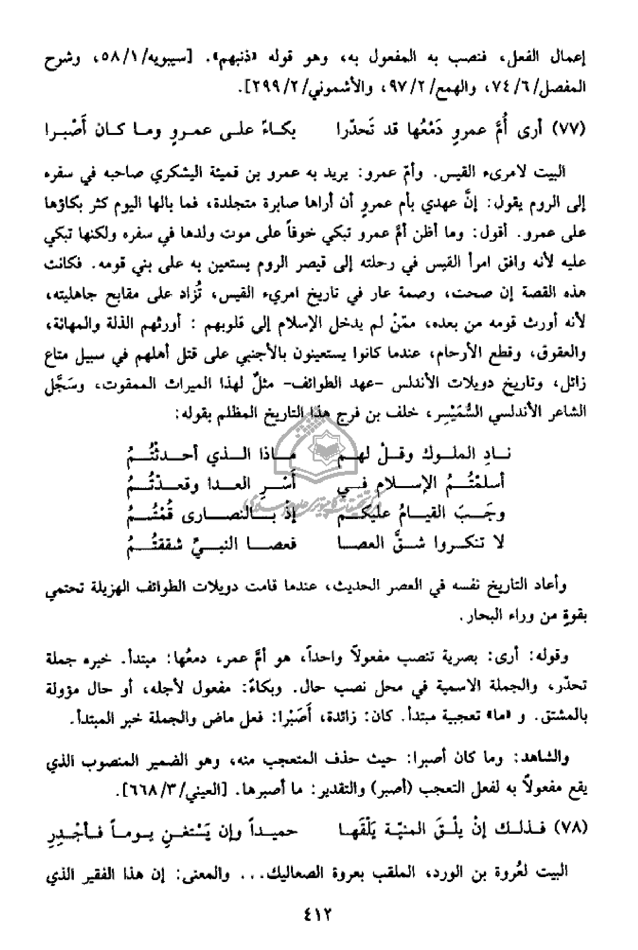 البيت لامرئ القيس. وأمّ عمرو: يريد به عمرو بن قميئة اليشكري صاحبه في سفره إلى الروم يقول: إنّ عهدي بأم عمرو أن أراها صابرة متجلدة، فما بالها اليوم كثر بكاؤها على عمرو. أقول: وما أظن أمّ عمرو تبكي خوفا على موت ولدها في سفره ولكنها تبكي عليه لأنه وافق امرأ القيس في رحلته إلى قيصر الروم يستعين به على بني قومه. فكانت هذه القصة إن صحت، وصمة عار في تاريخ امريء القيس، تزاد على مقابح جاهليته، لأنه أورث قومه من بعده، ممّن لم يدخل الإسلام إلى قلوبهم: أورثهم الذلة والمهانة، والعقوق، وقطع الأرحام، عند ما كانوا يستعينون بالأجنبي على قتل أهلهم في سبيل متاع زائل، وتاريخ دويلات الأندلس - عهد الطوائف - مثل لهذا الميراث الممقوت، وسجّل الشاعر الأندلسي السّميسر، خلف بن فرج هذا التاريخ المظلم بقوله: