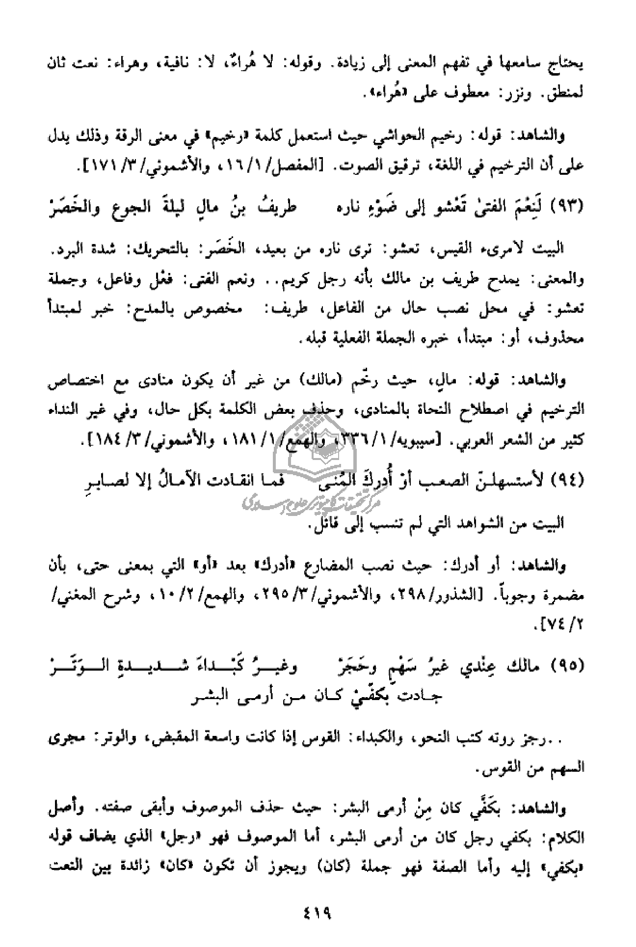 والشاهد: قوله: مال، حيث رخّم (مالك) من غير أن يكون منادى مع اختصاص الترخيم في اصطلاح النحاة