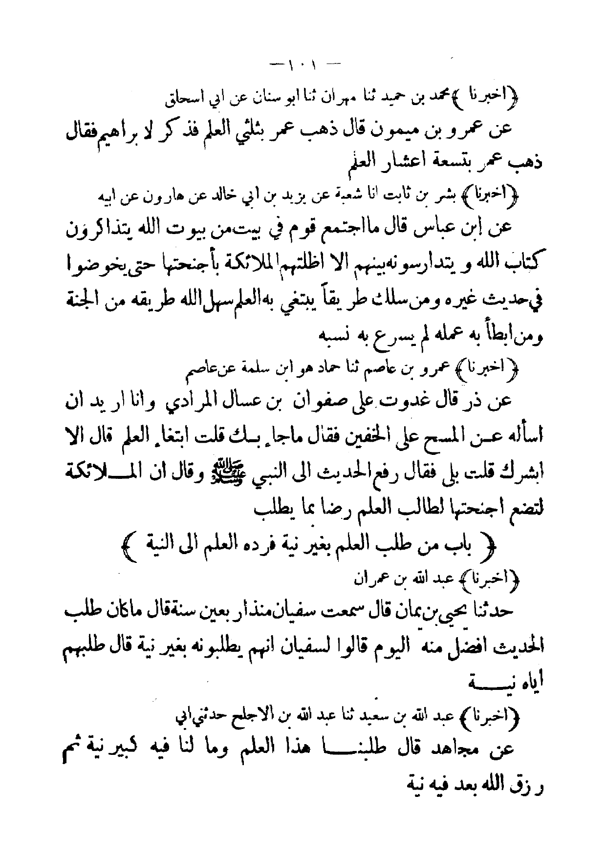 (أخبرنا) عبد الله بن عمران حدثنا يحيى بن يمان قال سمعت سفيان منذ اربعين سنة قال ما كان طلب الحديث افضل منه اليوم قالوا لسفيان انهم يطلبونه بغير نية قال طلبهم اياه نية