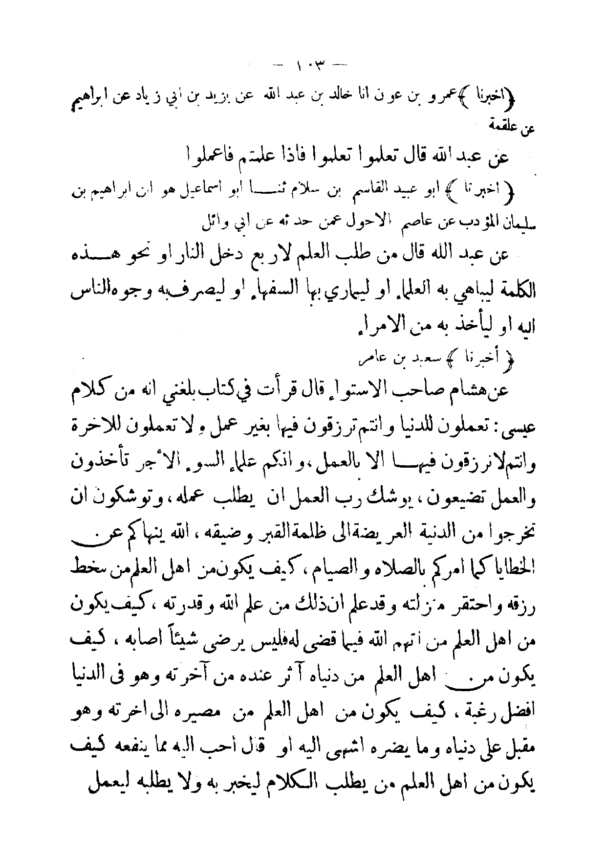 (أخبرنا) أبو عبيد القاسم بن سلام ثنا أبو اسماعيل هو ابن ابراهيم بن سليمان المؤدب عن عاصم الاحول عمن حدثه عن ابي وائل عن عبد الله قال من طلب العلم لاربع دخل النار أو نحو هذه الكلمة ليباهي به العلماء أو ليماري بها السفهاء أو ليصرف به وجوه الناس إليه أو ليأخذ به من الامراء