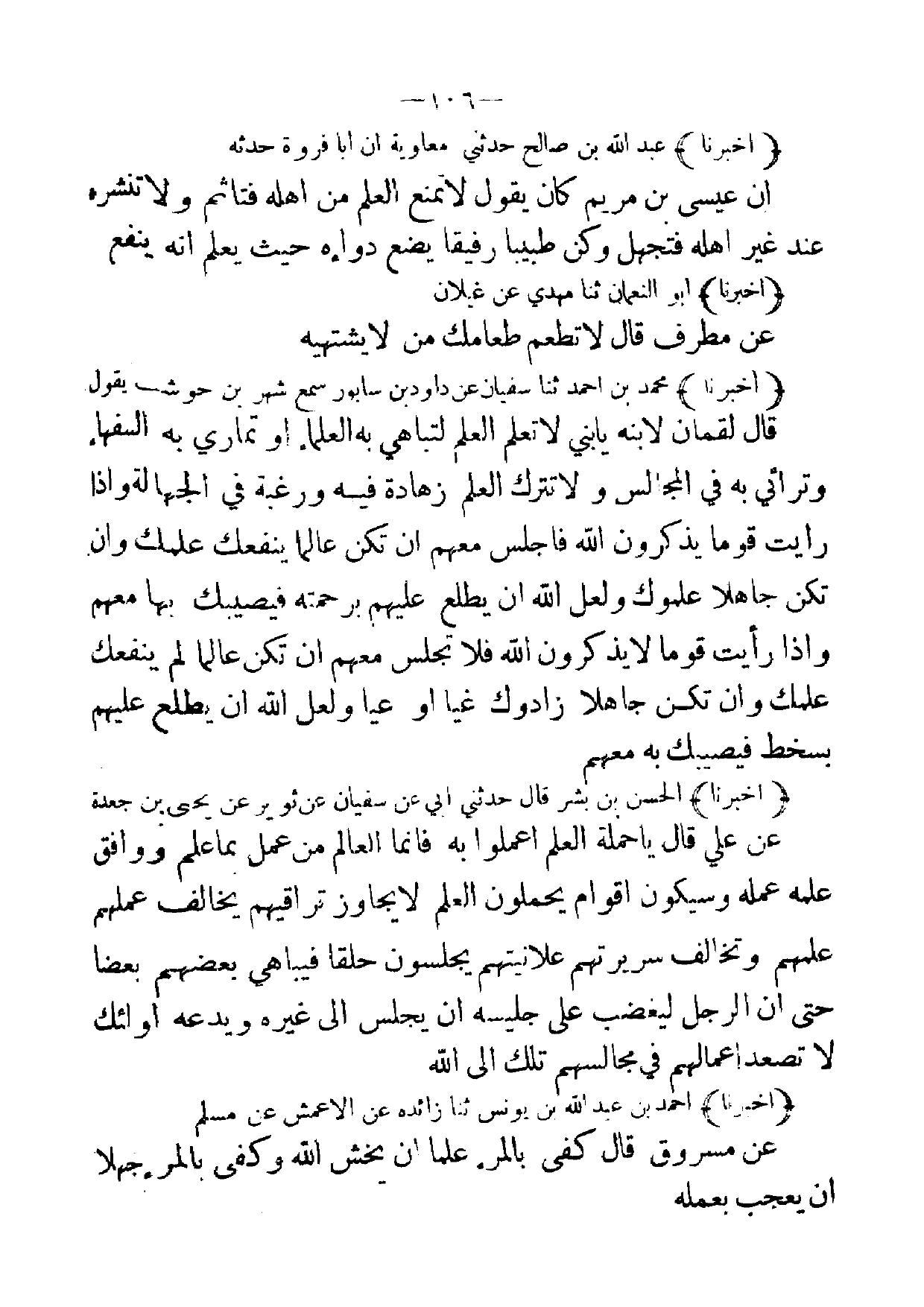(أخبرنا) عبد الله بن صالح حدثني معاوية ان ابا فروة حدثه ان عيسى بن مريم كان يقول لا تمنع العلم من اهله فتاثم ولا تنشره عند غير اهله فتجهل وكن طبيبا رفيقا يضع دواءه حيث يعلم انه ينفع