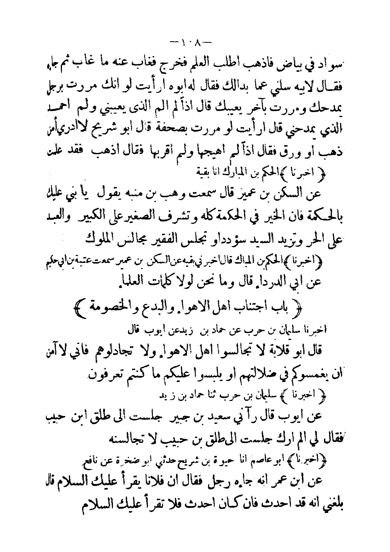 (باب اجتناب اهل الاهواء والبدع والخصومة) اخبرنا سليمان بن حرب عن حماد بن زيد عن ايوب قال قال أبو قلابة لا تجالسوا اهل الاهواء ولا تجادلوهم فاني لا آمن ان يغمسوكم في ضلالتهم أو يلبسوا عليكم ما كنتم تعرفون