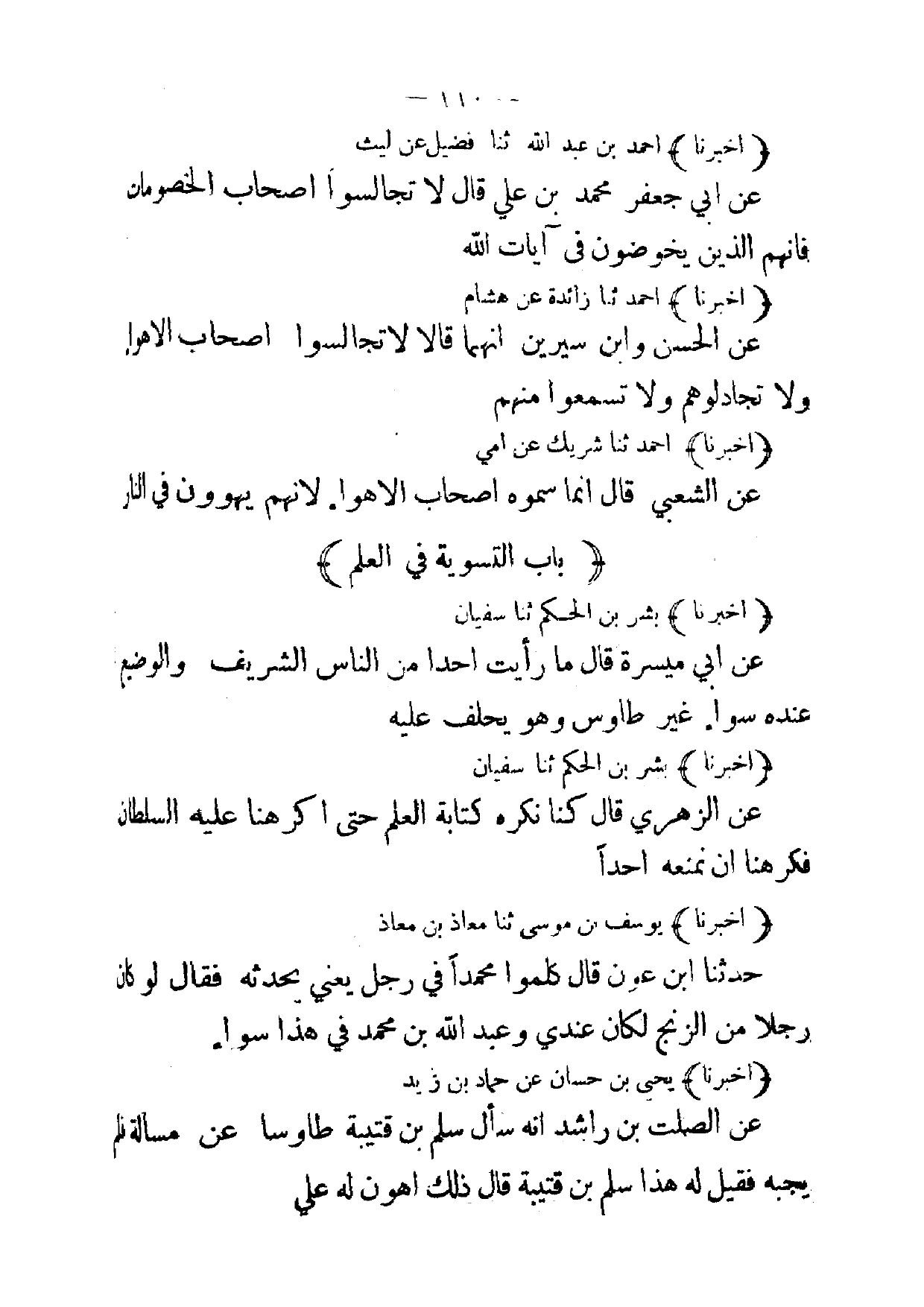 (أخبرنا) بشر بن الحكم ثنا سفيان عن الزهري قال كنا نكره كتابة العلم حتى اكرهنا عليه السلطان فكرهنا ان نمنعه احدا