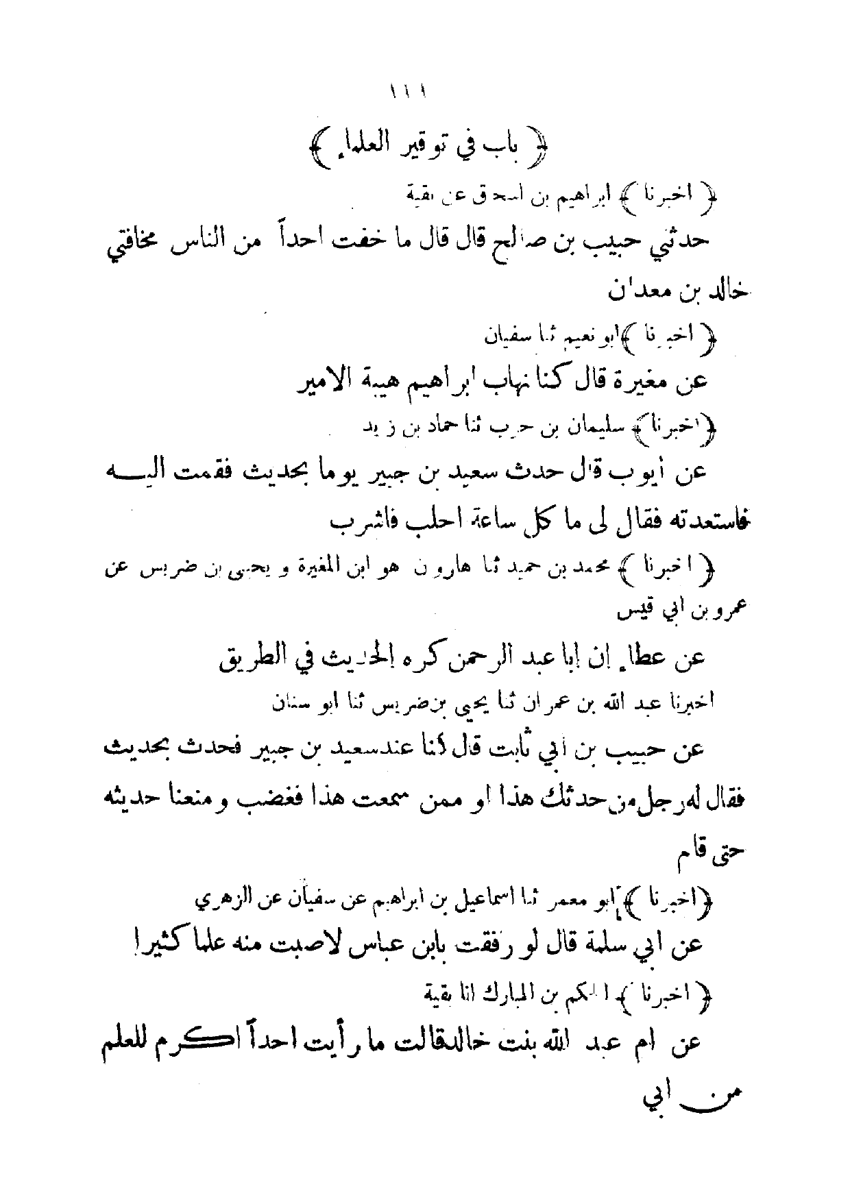 (أخبرنا) محمد بن حميد ثنا هارون هو ابن المغيرة ويحيى بن ضريس عن عمرو بن ابي قيس عن عطاء ان ابا عبد الرحمن كره الحديث في الطريق اخبرنا عبد الله بن عمران ثنا يحيى بن ضريس ثنا أبو سنان عن حبيب بن ابي ثابت قال كنا عند سعيد بن جبير فحدث بحديث فقال له رجل من حدثك هذا أو ممن سمعت هذا فغضب ومنعنا حديثه حتى قام