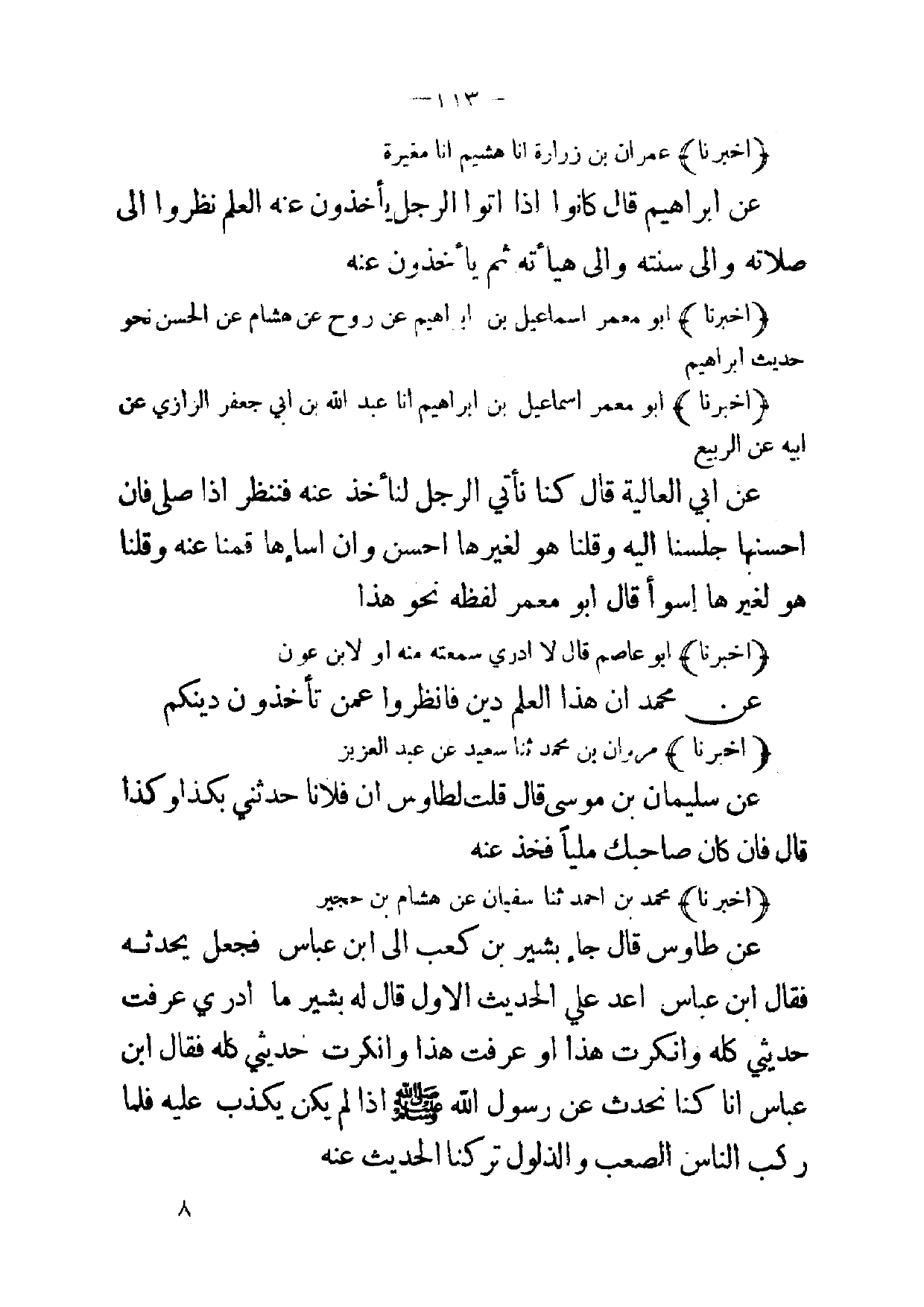 (أخبرنا) عمران بن زرارة انا هشيم انا مغيرة عن ابراهيم قال كانوا إذا اتوا الرجل يأخذون عنه العلم نظروا إلى صلاته والى سنته والى هيأته ثم يأخذون عنه