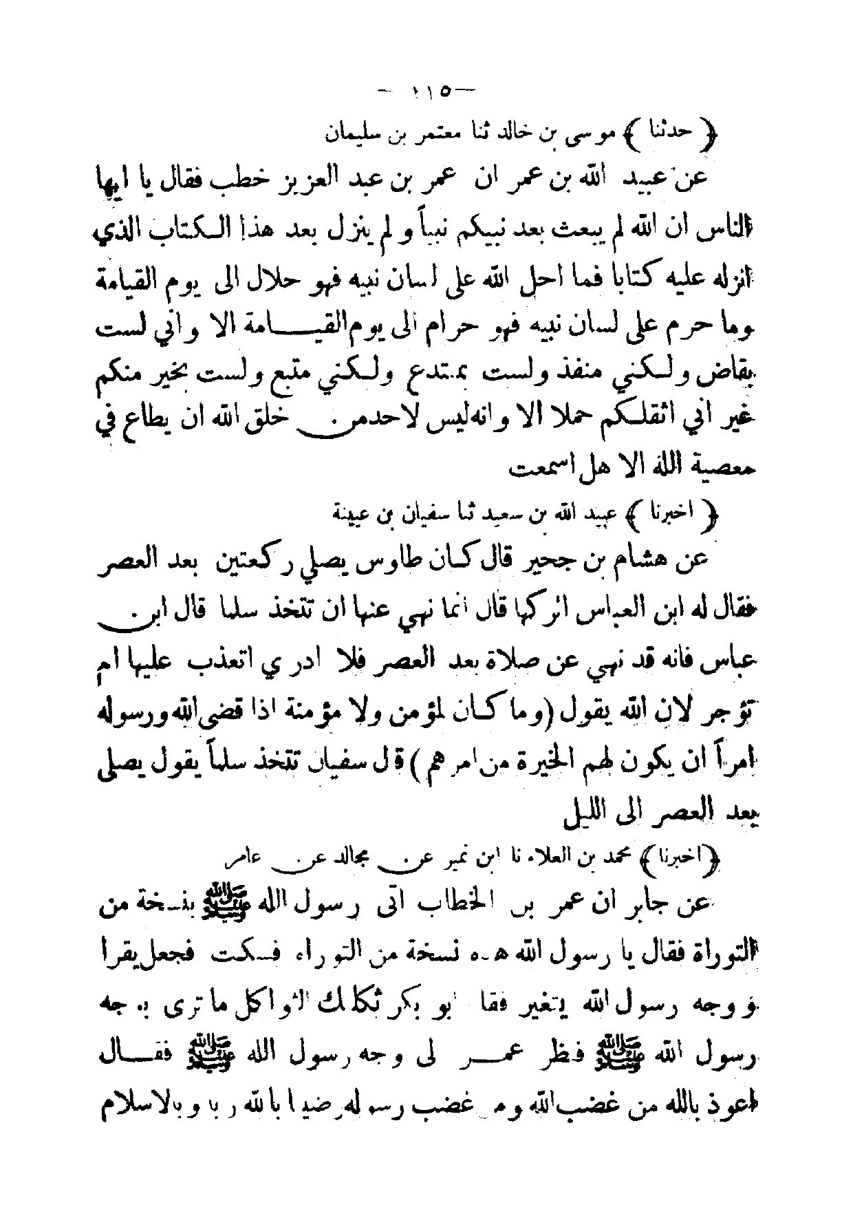 (حدثنا) موسى بن خالد ثنا معتمر بن سليمان عن عبيد الله بن عمران عمر بن عبد العزيز خطب فقال يا ايها الناس ان الله لم يبعث بعد نبيكم نبيا ولم ينزل بعد هذا الكتاب الذي انزله عليه كتابا فما احل الله على لسان نبيه فهو حلال إلى يوم القيامة وما حرم على لسان نبيه فهو حرام إلى يوم القيامة الا واني لست بقاض ولكني منفذ ولست بمبتدع ولكني متبع ولست بخير منكم غير اني اثقلكم حملا الا وانه ليس لاحد من خلق الله ان يطاع في معصية الله الا هل اسمعت