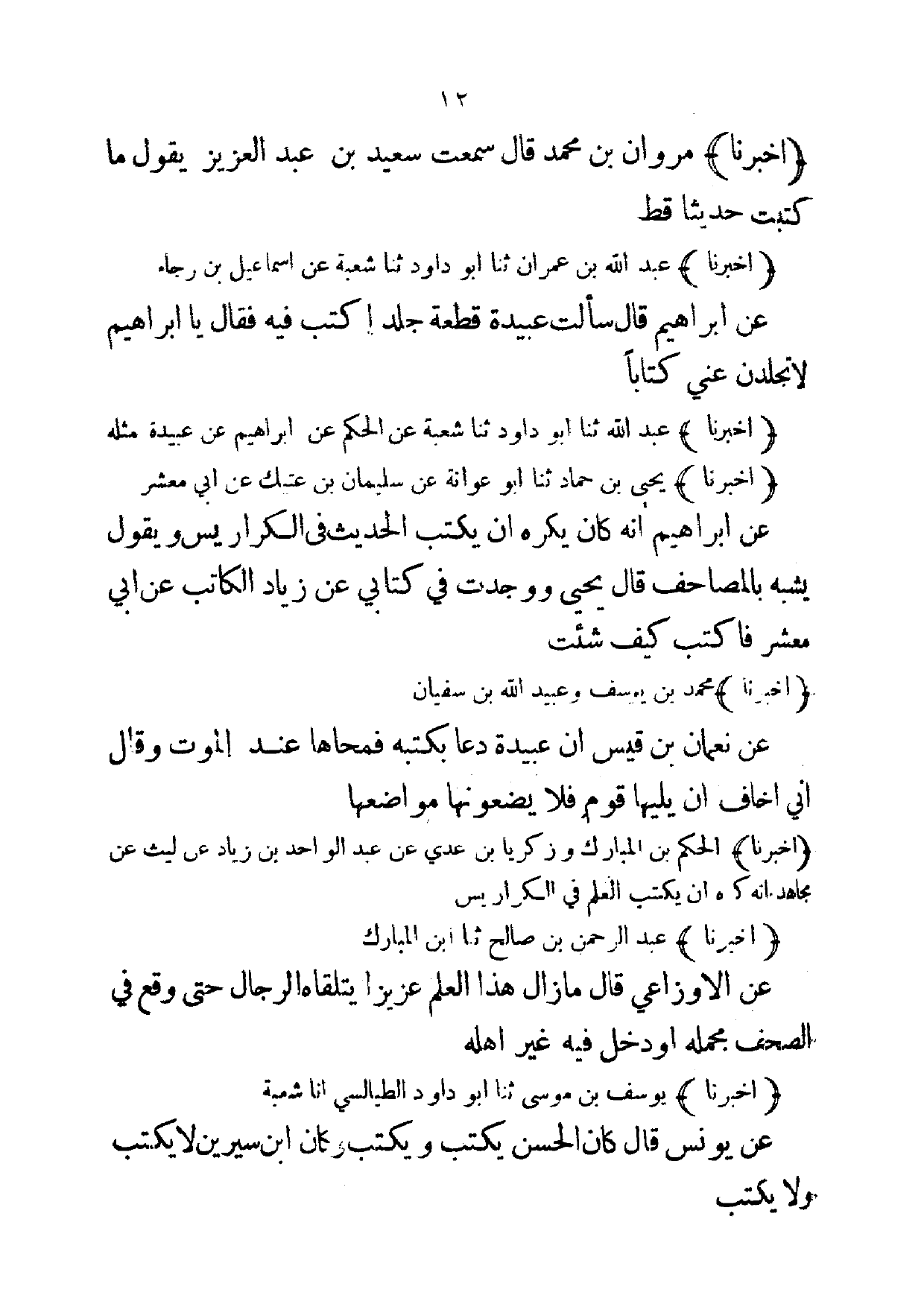 (أخبرنا) الحكم بن المبارك وزكريا بن عدي عن عبد الواحد بن زياد عن ليث عن مجاهد انه كره ان يكتب العلم في الكراريس