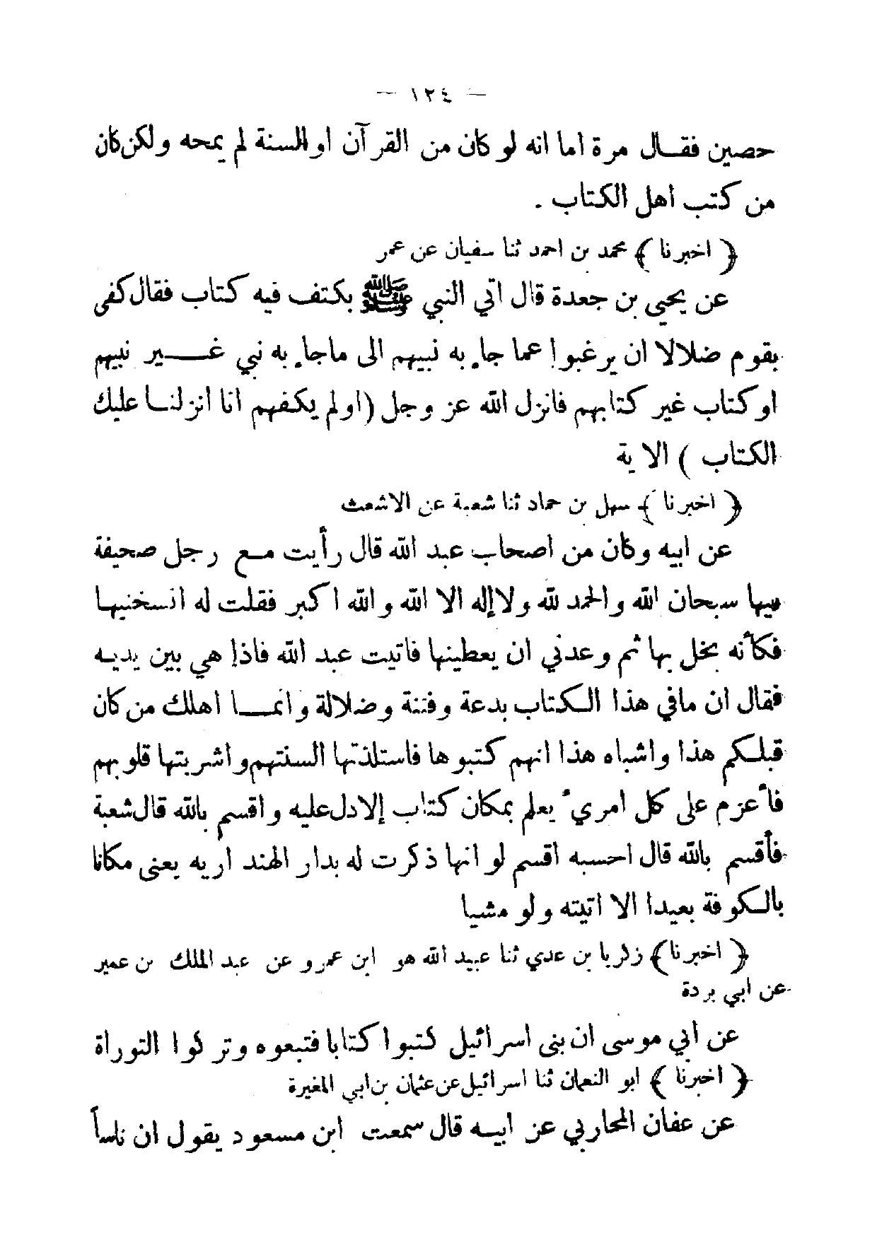 (أخبرنا) سهل بن حماد ثنا شعبة عن الاشعث عن ابيه وكان من اصحاب عبد الله قال رأيت مع رجل صحيفة فيها سبحان الله والحمد لله ولا إله الا الله والله اكبر فقلت له انسخنيها فكأنه بخل بها ثم وعدني ان يعطينها فاتيت عبد الله فإذا هي بين يديه فقال ان ما في هذا الكتاب بدعة وفتنة وضلالة وانما اهلك من كان قبلكم هذا واشباه هذا انهم كتبوها فاستلذتها السنتهم واشربتها قلوبهم فأعزم على كل امرئ يعلم بمكان كتاب إلا دل عليه واقسم بالله قال شعبة فأقسم بالله قال احسبه اقسم لو انها ذكرت له بدار الهند اريه يعنى مكانا بالكوفة بعيدا الا اتيته ولو مشيا