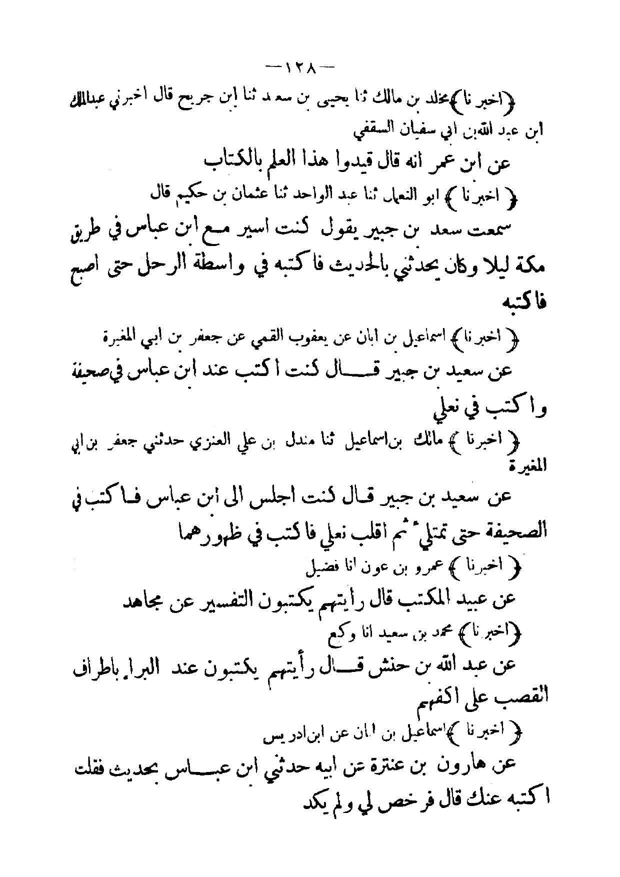 (أخبرنا) مخلد بن مالك ثنا يحيى بن سعيد ثنا ابن جريح قال اخبرني عبد الملك ابن عبد الله بن ابي سفيان السقفي عن ابن عمر انه قال قيدوا هذا العلم بالكتاب