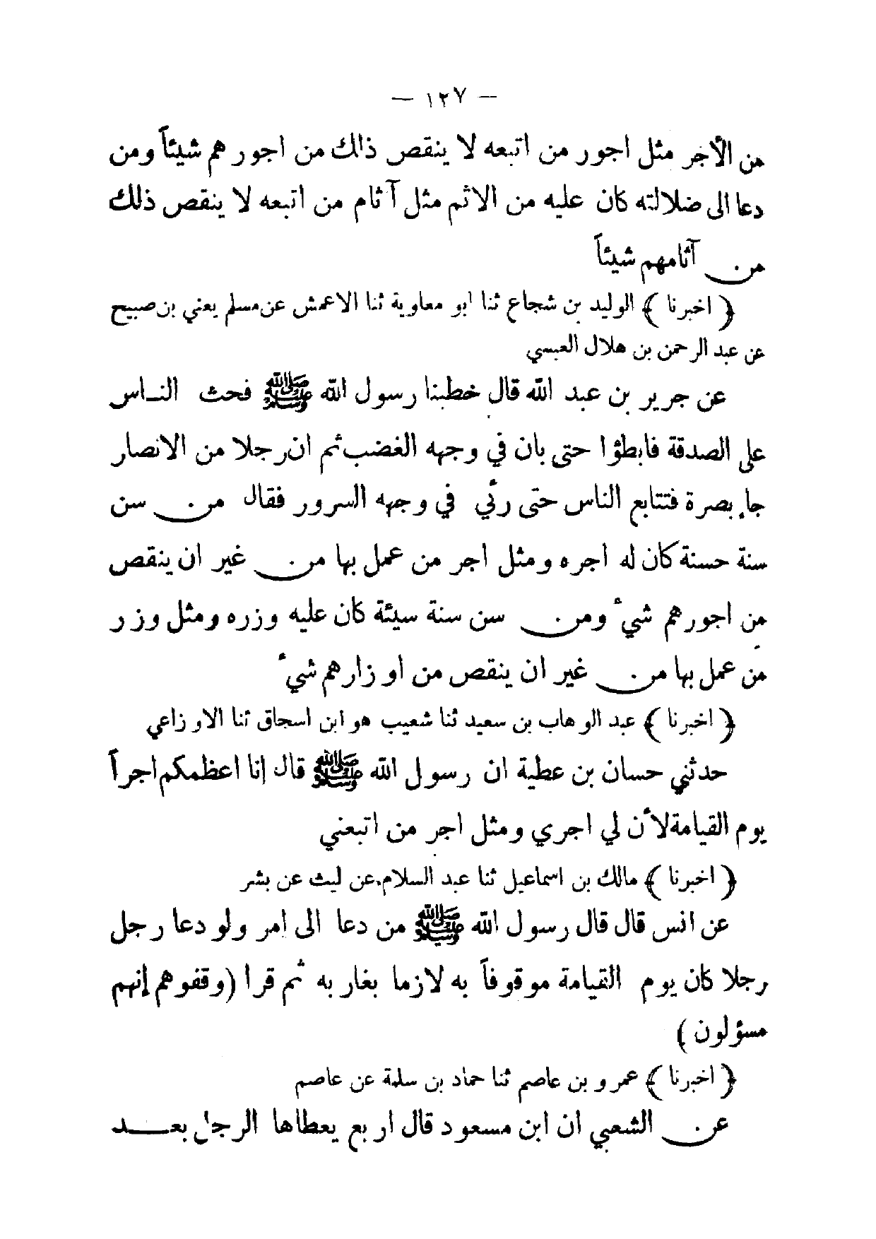 [ 131 ] من الاجر مثل اجور من اتبعه لا ينقص ذلك من اجور هم شيئا ومن دعا إلى ضلالته كان عليه من الاثم مثل آثام من اتبعه لا ينقص ذلك من آثامهم شيئا