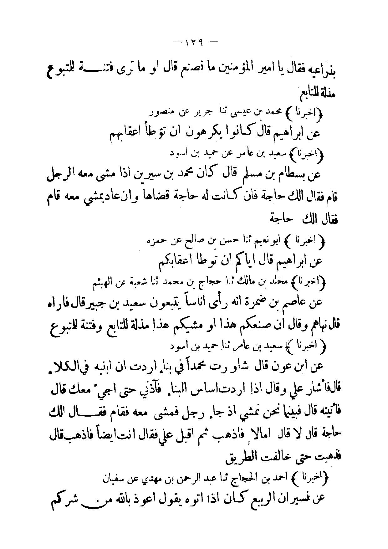 (أخبرنا) محمد بن عيسى ثنا جرير عن منصور عن ابراهيم قال كانوا يكرهون ان تؤطأ اعقابهم