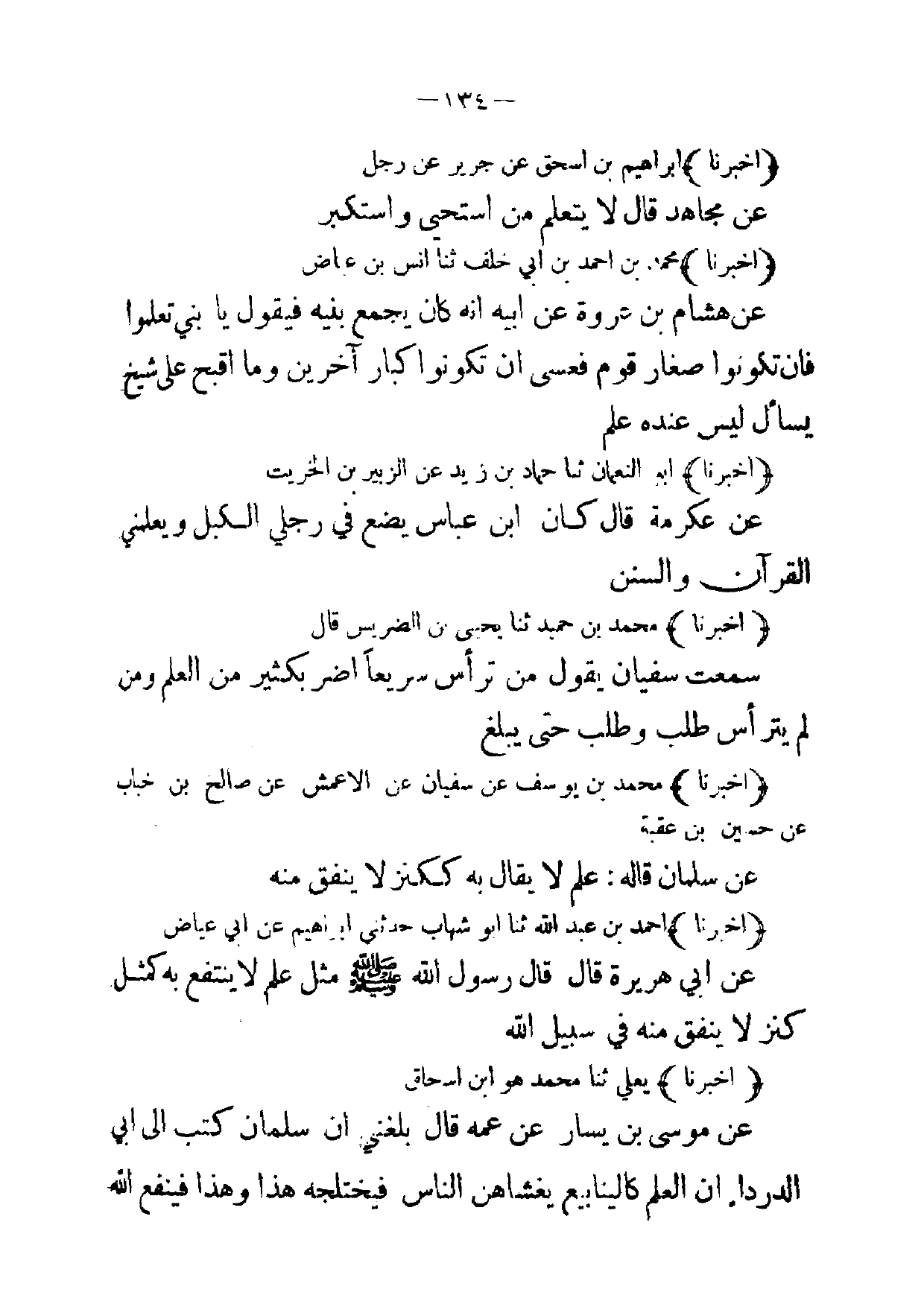(أخبرنا) محمد بن حميد ثنا يحيى بن الضريس قال سمعت سفيان يقول من ترأس سريعا اضر بكثير من العلم ومن لم يترأس طلب وطلب حتى يبلغ