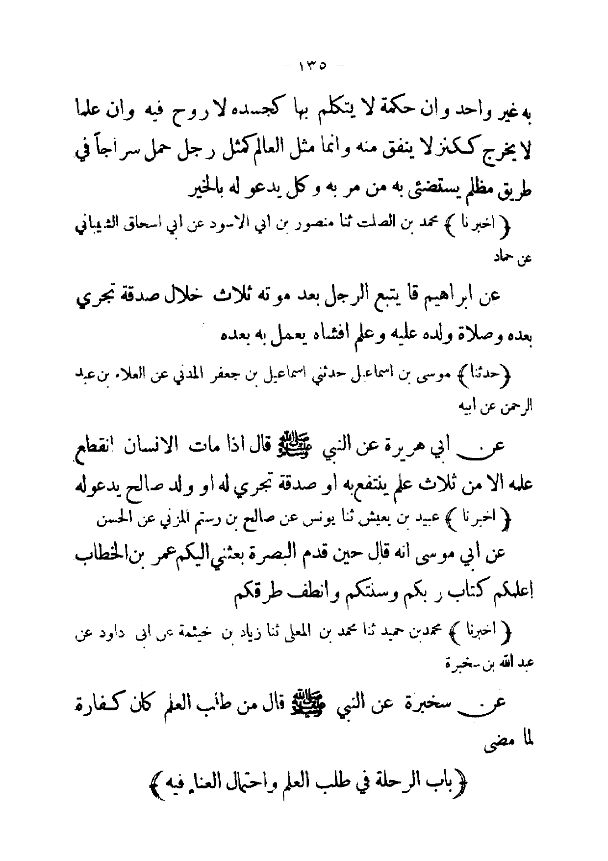 (أخبرنا) محمد بن حميد ثنا محمد بن المعلى ثنا زياد بن خيثمة عن ابى داود عن عبد الله بن سخبرة عن سخبرة عن النبي صلى الله عليه وسلم قال من طلب العلم كان كفارة لما مضى
