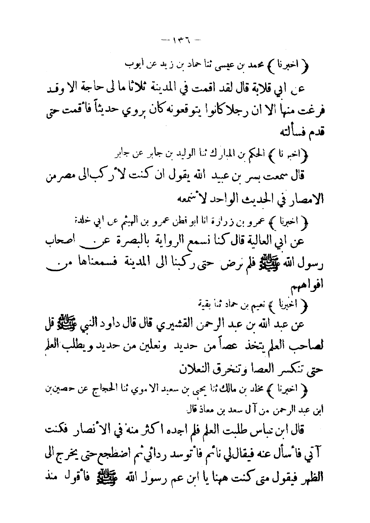 (أخبرنا) محمد بن عيسى ثنا حماد بن زيد عن ايوب عن ابي قلابة قال لقد اقمت في المدينة ثلاثا ما لى حاجة الا وقد فرغت منها الا ان رجلا كانوا يتوقعونه كان يروي حديثا فأقمت حتى قدم فسألته