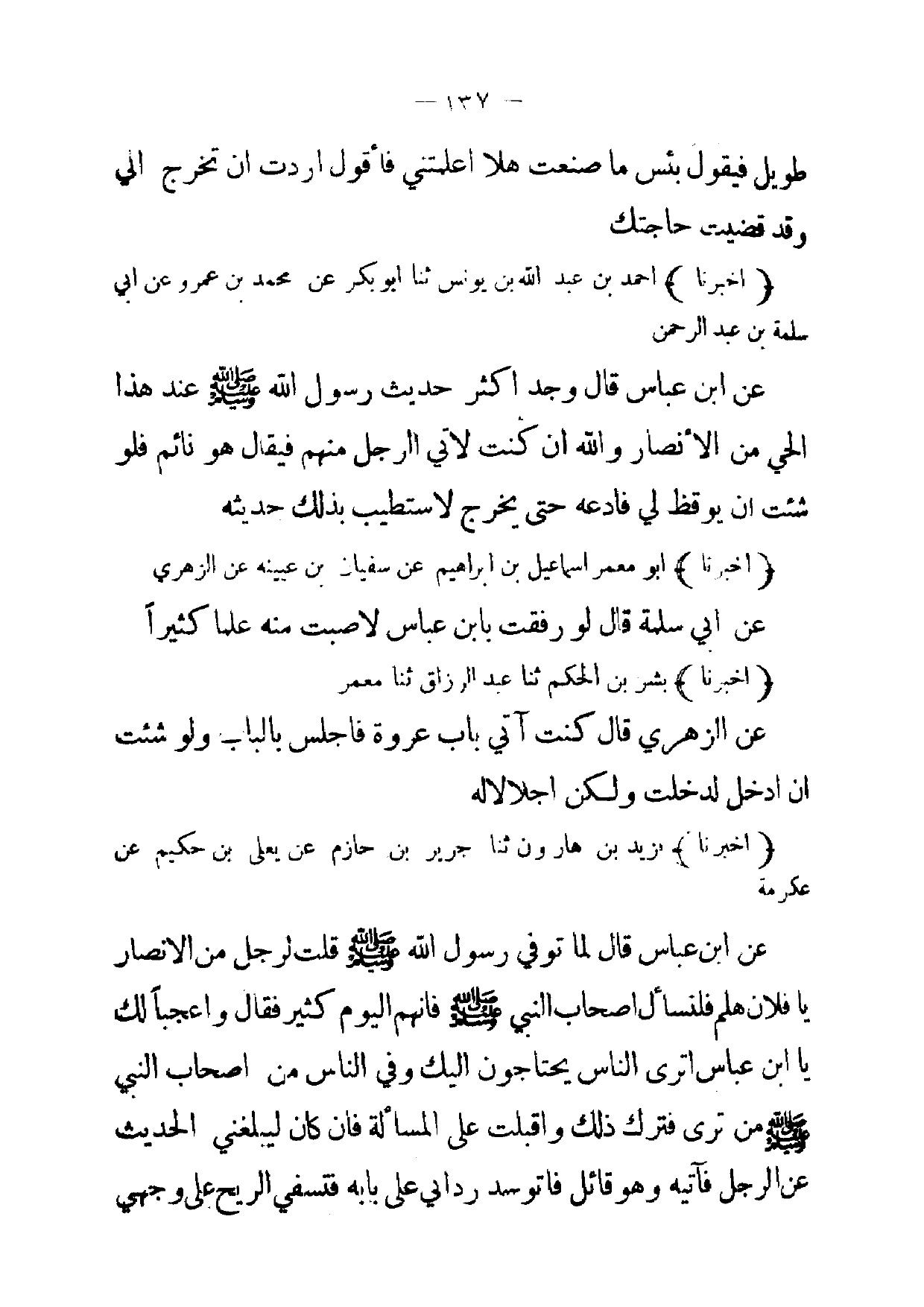 (أخبرنا) يزيد بن هارون ثنا جرير بن حازم عن يعلى بن حكيم عن عكرمة عن ابن عباس قال لما توفي رسول الله صلى الله عليه وسلم قلت لرجل من الانصار يا فلان هلم فلنسأل اصحاب النبي صلى الله عليه وسلم فانهم اليوم كثير فقال واعجبا لك يا ابن عباس اترى الناس تحتاجون اليك وفي الناس من اصحاب النبي صلى الله عليه وسلم من ترى فترك ذلك واقبلت على المسألة فان كان ليبلغني الحديث عن الرجل فآتيه وهو قائل فاتوسد ردائي على بابه فتسفي الريح على وجهي