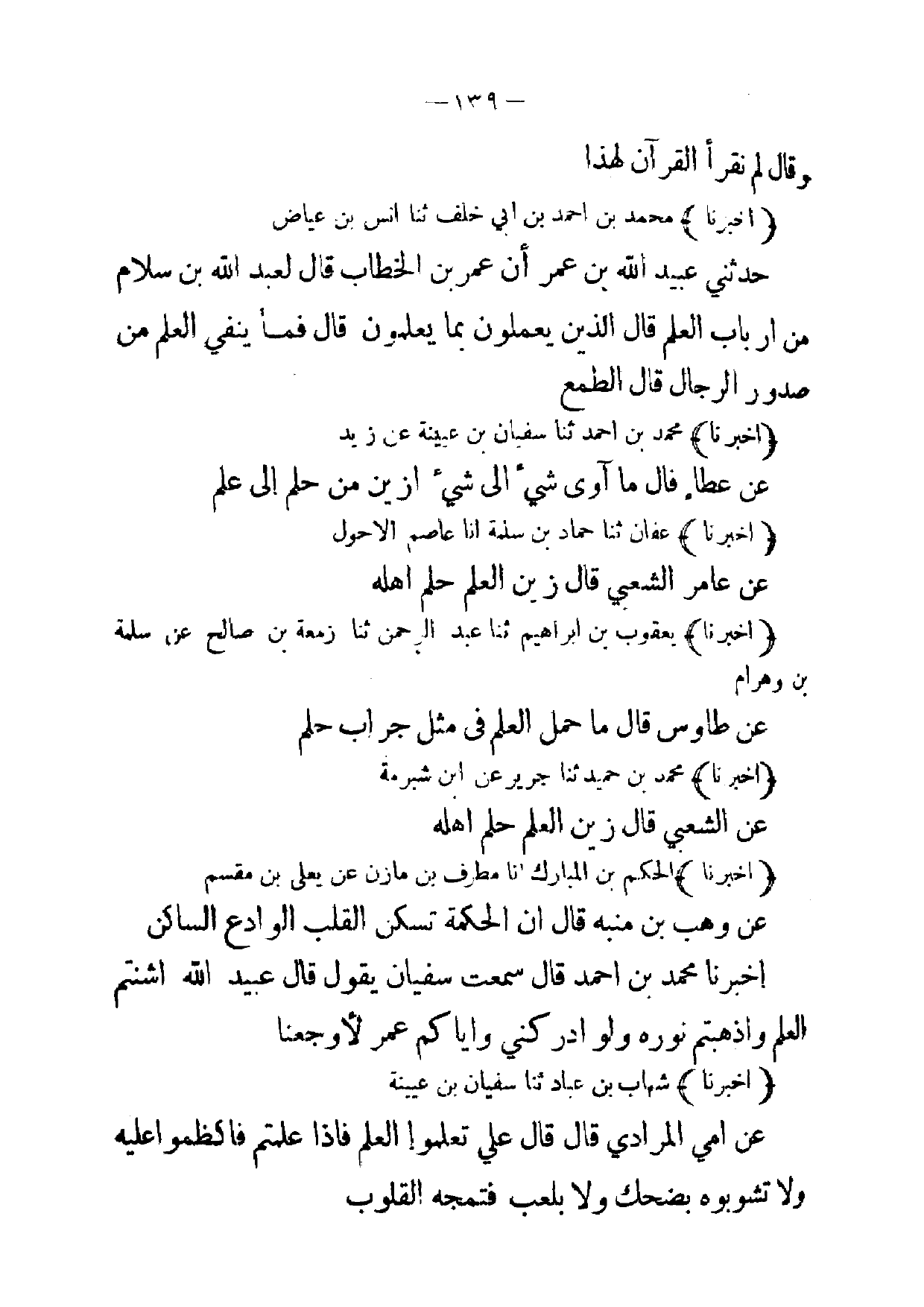 (أخبرنا) الحكم بن المبارك انا مطرف بن مازن عن يعلى بن مقسم عن وهب بن منبه قال ان الحكمة تسكن القلب الوادع الساكن اخبرنا محمد بن احمد قال سمعت سفيان يقول قال عبيدالله اشنتم العلم واذهبتم نوره ولو ادركني واياكم عمر لاوجعنا